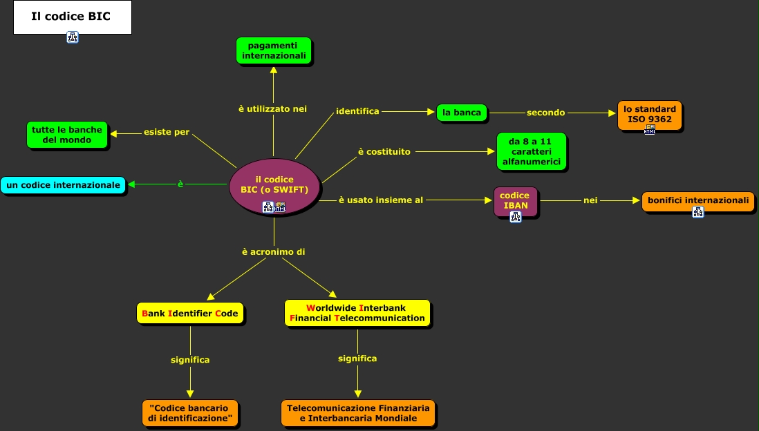 Il codice BIC, codice IBAN nei bonifici internazionali, il codice BIC (o SWIFT) è costituito da 8 a 11 caratteri alfanumerici, Worldwide Interbank Financial Telecommunication significa Telecomunicazione Finanziaria e Interbancaria Mondiale, il codice BIC (o SWIFT) è usato insieme al codice IBAN, il codice BIC (o SWIFT) è acronimo di Bank Identifier Code, il codice BIC (o SWIFT) identifica la banca, Bank Identifier Code significa "Codice bancario di identificazione", la banca secondo lo standard ISO 9362, il codice BIC (o SWIFT) esiste per tutte le banche del mondo, il codice BIC (o SWIFT) è utilizzato nei pagamenti internazionali