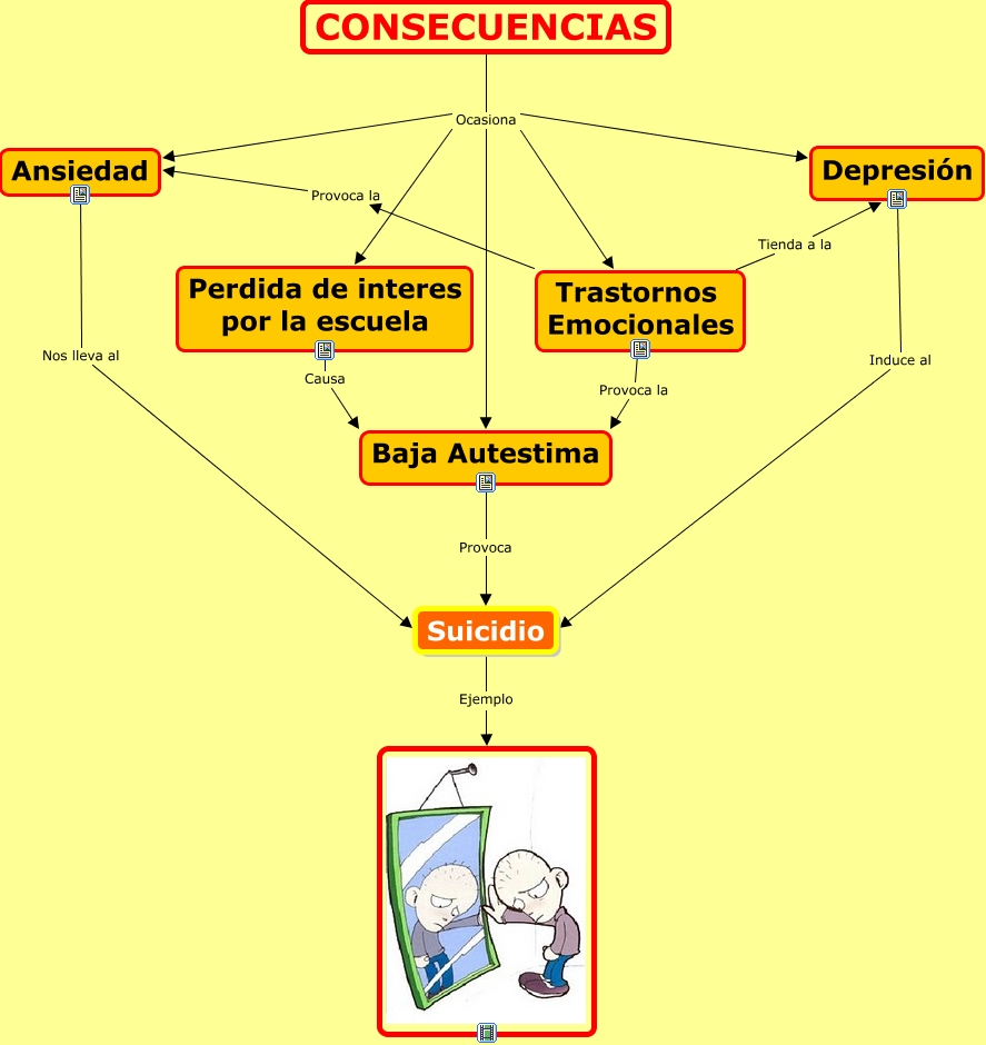 Este Cmap, tiene información relacionada con: Consecuencias, CONSECUENCIAS Ocasiona Trastornos Emocionales, Perdida de interes por la escuela Causa Baja Autestima, Trastornos Emocionales Tienda a la Depresión, Trastornos Emocionales Provoca la Baja Autestima, CONSECUENCIAS Ocasiona Depresión, CONSECUENCIAS Ocasiona Baja Autestima, CONSECUENCIAS Ocasiona Ansiedad, Baja Autestima Provoca Suicidio, Depresión Induce al Suicidio, Ansiedad Nos lleva al Suicidio, CONSECUENCIAS Ocasiona Perdida de interes por la escuela, Suicidio Ejemplo, Trastornos Emocionales Provoca la Ansiedad