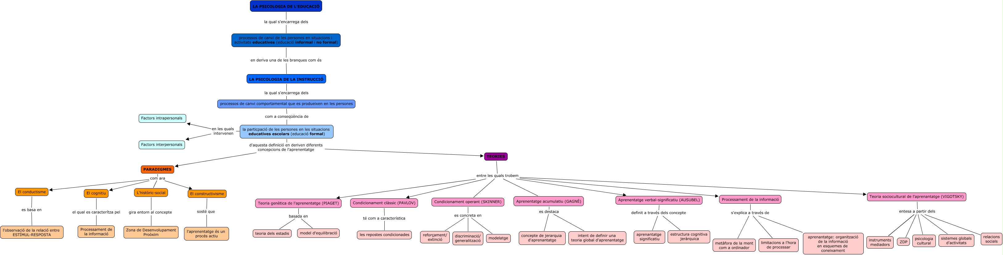 Este Cmap, tiene información relacionada con: psicologia de la instrucció, Teoria genètica de l'aprenentatge (PIAGET) basada en teoria dels estadis, L'històric-social gira entorn al concepte Zona de Desenvolupament Proòxim, Teoria sociocultural de l'aprenantatge (VIGOTSKY) entesa a partir dels psicologia cultural, TEORIES entre les quals trobem Teoria genètica de l'aprenentatge (PIAGET), LA PSICOLOGIA DE LA INSTRUCCIÓ la qual s'encarrega dels processos de canvi comportamental que es produeixen en les persones, TEORIES entre les quals trobem Aprenentatge verbal-significatiu (AUSUBEL), instruments mediadors entesa a partir dels sistemes globals d'activitats, instruments mediadors entesa a partir dels relacions socials, Condicionament operant (SKINNER) es concreta en modelatge, instruments mediadors entesa a partir dels psicologia cultural, PARADIGMES com ara L'històric-social, PARADIGMES com ara El constructivisme, Condicionament clàssic (PAVLOV) té com a característica les repostes condicionades, LA PSICOLOGIA DE L'EDUCACIÓ la qual s'encarrega dels processos de canvi de les persones en situacions i activitats educatives (educació informal i no formal), la particpació de les persones en les situacions educatives escolars (educació formal) en les quals intervenen Factors intrapersonals, processos de canvi comportamental que es produeixen en les persones com a conseqüència de la particpació de les persones en les situacions educatives escolars (educació formal), Teoria sociocultural de l'aprenantatge (VIGOTSKY) entesa a partir dels ZDP, El constructivisme sosté que l'aprenentatge és un procés actiu, Condicionament operant (SKINNER) es concreta en reforçament/ extinció, la particpació de les persones en les situacions educatives escolars (educació formal) d'aquesta definició en deriven diferents concepcions de l'aprenentatge TEORIES