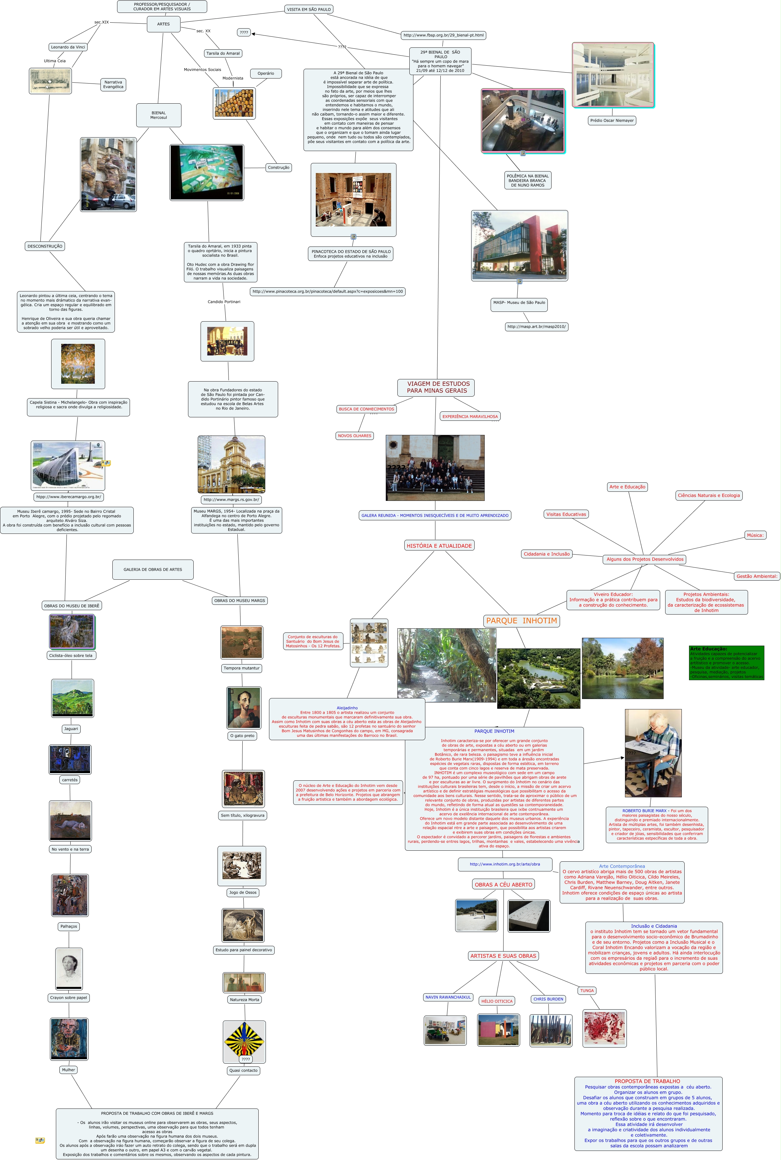 Esse mapa conceitual, produzido no IHMC CmapTools, tem a informação relacionada a: mapa curador são paulo e minas, Museu Iberê camargo, 1995- Sede no Bairro Cristal em Porto Alegre, com o prédio projetado pelo regomado arquiteto Alváro Siza. A obra foi construída com benefício a inclusão cultural com pessoas deficientes. ???? OBRAS DO MUSEU DE IBERÊ, ARTES ???? VISITA EM SÃO PAULO, Alguns dos Projetos Desenvolvidos ???? Cidadania e Inclusão, ???? PINACOTECA DO ESTADO DE SÃO PAULO Enfoca projetos educativos na inclusão, ???? ???? Mulher, ???? Museu Iberê camargo, 1995- Sede no Bairro Cristal em Porto Alegre, com o prédio projetado pelo regomado arquiteto Alváro Siza. A obra foi construída com benefício a inclusão cultural com pessoas deficientes., ???? Narrativa Evangélica, ???? Capela Sistina - Michelangelo- Obra com inspiração religiosa e sacra onde divulga a religiosidade., ARTES Movimentos Sociais, 29ª BIENAL DE SÃO PAULO "Há sempre um copo de mara para o homem navegar" 21/09 até 12/12 de 2010 ???? VIAGEM DE ESTUDOS PARA MINAS GERAIS, Alguns dos Projetos Desenvolvidos ???? Ciências Naturais e Ecologia, OBRAS DO MUSEU MARGS ????, BUSCA DE CONHECIMENTOS ???? NOVOS OLHARES, Inclusão e Cidadania o instituto Inhotim tem se tornado um vetor fundamental para o desenvolvimento socio-econômico de Brumadinho e de seu entorno. Projetos como a Inclusão Musical e o Coral Inhotim Encando valorizam a vocação da região e mobilizam crianças, jovens e adultos. Há ainda interlocução com os empresários da regiaõ para o incremento de suas atividades econômicas e projetos em parceria com o poder público local. ???? PROPOSTA DE TRABALHO Pesquisar obras contemporâneas expostas a céu aberto. Organizar os alunos em grupo. Desafiar os alunos que construam em grupos de 5 alunos, uma obra a céu aberto utilizando os conhecimentos adquiridos e observação durante a pesquisa realizada. Momento para troca de idéias e relato do que foi pesquisado, reflexão sobre o que encontraram. Essa atividade irá desenvolver a imaginação e criatividade dos alunos individualmente e coletivamente. Expor os trabalhos para que os outros grupos e de outras salas da escola possam analizarem, http://www.inhotim.org.br/arte/obra ???? Arte Contemporânea O cervo artistíco abriga mais de 500 obras de artistas como Adriana Varejão, Hélio Oiticica, Cildo Meireles, Chris Burden, Matthew Barney, Doug Aitken, Janete Cardiff, Rivane Neuenschwander, entre outros. Inhotim oferece condições de espaço únicas ao artista para a realização de suas obras., VIAGEM DE ESTUDOS PARA MINAS GERAIS ????, ???? Aleijadinho Entre 1800 a 1805 o artista realizou um conjunto de esculturas monumentais que marcaram definitivamente sua obra. Assim como Inhotim com suas obras a céu aberto esta as obras de Aleijadinho esculturas feita de pedra sabão, são 12 profetas no santuário do senhor Bom Jesus Matusinhos de Congonhas do campo, em MG, consagrada uma das últimas manifestações do Barroco no Brasil., ???? Jaguari, Leonardo da Vinci Ultima Ceia, Jaguari ???? ????