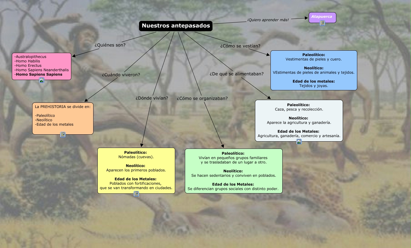 Este Cmap, tiene información relacionada con: Nuestros antepasados, Nuestros antepasados ¿Cómo se organizaban? Paleolítico: Vivían en pequeños grupos familiares y se trasladaban de un lugar a otro. Neolítico: Se hacen sedentarios y conviven en poblados. Edad de los Metales: Se diferencian grupos sociales con distinto poder., Nuestros antepasados ¿Dónde vivían? Paleolítico: Nómadas (cuevas). Neolítico: Aparecen los primeros poblados. Edad de los Metales: Poblados con fortificaciones, que se van transformando en ciudades., Nuestros antepasados ¿Cuándo viveron? La PREHISTORIA se divide en: -Paleolítico -Neolítico -Edad de los metales, Nuestros antepasados ¿Cómo se vestían? Paleolítico: Vestimentas de pieles y cuero. Neolítico: VEstimentas de pieles de animales y tejidos. Edad de los metales: Tejidos y joyas., Nuestros antepasados ¡Quiero aprender más! Atapuerca, Nuestros antepasados ¿Quiénes son? -Australopithecus -Homo Habilis -Homo Erectus -Homo Sapiens Neanderthalis -Homo Sapiens Sapiens, Nuestros antepasados ¿De qué se alimentaban? Paleolítico: Caza, pesca y recolección. Neolítico: Aparece la agricultura y ganadería. Edad de los Metales: Agricultura, ganadería, comercio y artesanía.