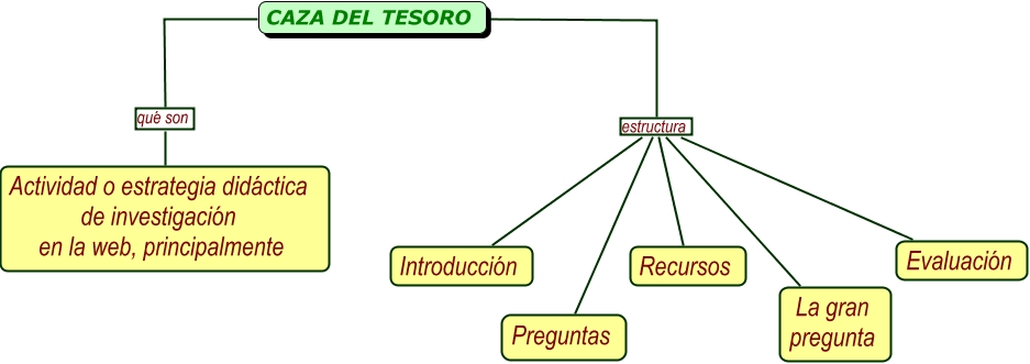 Este Cmap, tiene información relacionada con: Caza del Tesoro, CAZA DEL TESORO estructura La gran pregunta, CAZA DEL TESORO estructura Preguntas, CAZA DEL TESORO estructura Evaluación, CAZA DEL TESORO estructura Introducción, CAZA DEL TESORO qué son Actividad o estrategia didáctica de investigación en la web, principalmente, CAZA DEL TESORO estructura Recursos