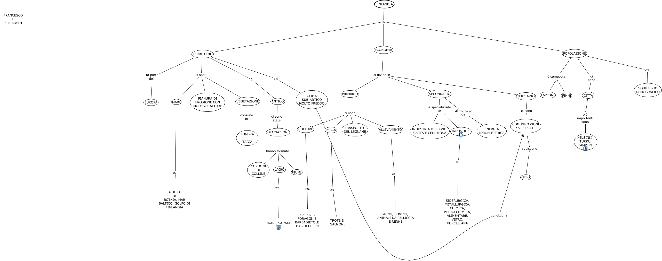 Questa Cmap, creata con IHMC CmapTools, contiene informazioni relative a: Finlandia_pc07, LAGHI es. INARI, SAIMAA, PESCA es. TROTE E SALMONI, TERRITORIO ci sono VEGETAZIONE, VEGETAZIONE consiste in TUNDRA E TAIGA, POPOLAZIONE è composta da LAPPONI, GLACIAZIONI hanno formato CORDONI DI COLLINE, COLTURE es. CEREALI, FORAGGI, E BARBABIETOLE DA ZUCCHERO, SECONDARIO è specializzato in INDUSTRIA DI LEGNO, CARTA E CELLULOSA, FINLANDIA ha ECONOMIA, CITTÀ le più importanti sono HELSINKI, TURKU, TAMPERE, TERRITORIO ci sono MARI, GLACIAZIONI hanno formato FIUMI, FINLANDIA ha TERRITORIO, ECONOMIA si divide in PRIMARIO, PRIMARIO ci sono TRASPORTO DEL LEGNAME, POPOLAZIONE c'è SQUILIBRIO DEMOGRAFICO, TERRITORIO c'è CLIMA SUB-ARTICO MOLTO FREDDO, PRIMARIO ci sono COLTURE, ECONOMIA si divide in SECONDARIO, POPOLAZIONE è composta da FINNI