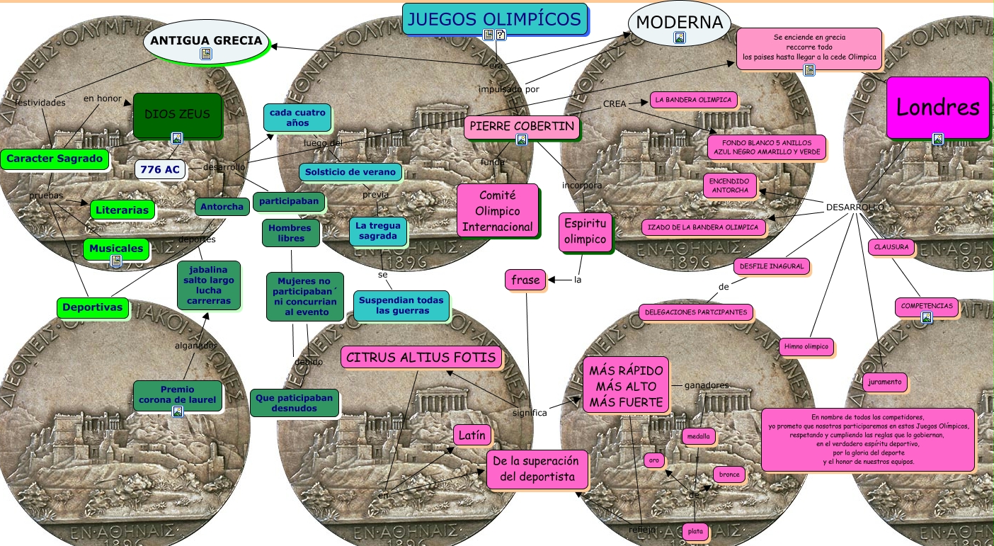 Este Cmap, tiene información relacionada con: olimpiadas, Solsticio de verano previa La tregua sagrada, Hombres libres debido Que paticipaban desnudos, medalla de plata, MODERNA impulsado por PIERRE COBERTIN, Londres DESARROLLO CLAUSURA, CITRUS ALTIUS FOTIS en De la superación del deportista, JUEGOS OLIMPÍCOS era ANTIGUA GRECIA, PIERRE COBERTIN funda Comité Olimpico Internacional, 776 AC desarrollo cada cuatro años, JUEGOS OLIMPÍCOS era MODERNA, Premio corona de laurel alganador jabalina salto largo lucha carrerras, ANTIGUA GRECIA festividades Caracter Sagrado, Caracter Sagrado las primeras 776 AC, Londres DESARROLLO Himno olimpico, La tregua sagrada se Suspendian todas las guerras, frase significa MÁS RÁPIDO MÁS ALTO MÁS FUERTE, Londres DESARROLLO COMPETENCIAS, Se enciende en grecia reccorre todo los paises hasta llegar a la cede Olimpica 2012 Londres, frase significa CITRUS ALTIUS FOTIS, CITRUS ALTIUS FOTIS en Latín