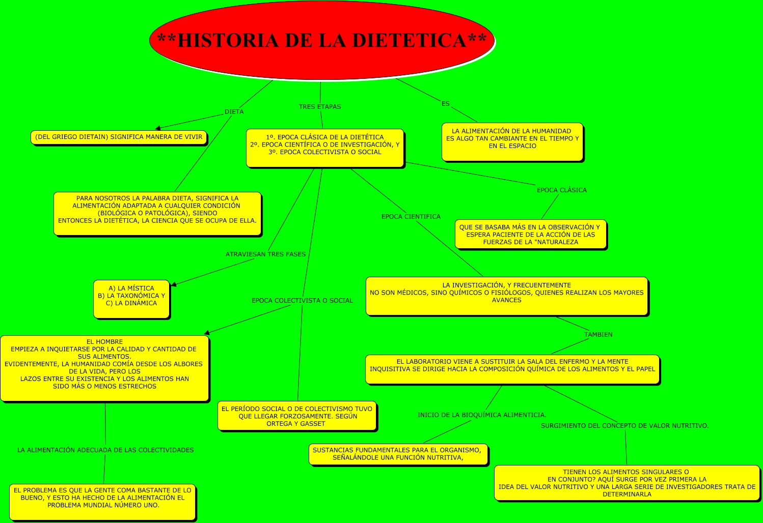 Este Cmap, tiene información relacionada con: HISTORIA DE LA DIETETICA, 1º. EPOCA CLÁSICA DE LA DIETÉTICA 2º. EPOCA CIENTÍFICA O DE INVESTIGACIÓN, Y 3º. EPOCA COLECTIVISTA O SOCIAL EPOCA COLECTIVISTA O SOCIAL EL HOMBRE EMPIEZA A INQUIETARSE POR LA CALIDAD Y CANTIDAD DE SUS ALIMENTOS. EVIDENTEMENTE, LA HUMANIDAD COMÍA DESDE LOS ALBORES DE LA VIDA, PERO LOS LAZOS ENTRE SU EXISTENCIA Y LOS ALIMENTOS HAN SIDO MÁS O MENOS ESTRECHOS, **HISTORIA DE LA DIETETICA** DIETA PARA NOSOTROS LA PALABRA DIETA, SIGNIFICA LA ALIMENTACIÓN ADAPTADA A CUALQUIER CONDICIÓN (BIOLÓGICA O PATOLÓGICA), SIENDO ENTONCES LA DIETÉTICA, LA CIENCIA QUE SE OCUPA DE ELLA., **HISTORIA DE LA DIETETICA** TRES ETAPAS 1º. EPOCA CLÁSICA DE LA DIETÉTICA 2º. EPOCA CIENTÍFICA O DE INVESTIGACIÓN, Y 3º. EPOCA COLECTIVISTA O SOCIAL, 1º. EPOCA CLÁSICA DE LA DIETÉTICA 2º. EPOCA CIENTÍFICA O DE INVESTIGACIÓN, Y 3º. EPOCA COLECTIVISTA O SOCIAL EPOCA COLECTIVISTA O SOCIAL EL PERÍODO SOCIAL O DE COLECTIVISMO TUVO QUE LLEGAR FORZOSAMENTE. SEGÚN ORTEGA Y GASSET, **HISTORIA DE LA DIETETICA** ES LA ALIMENTACIÓN DE LA HUMANIDAD ES ALGO TAN CAMBIANTE EN EL TIEMPO Y EN EL ESPACIO, **HISTORIA DE LA DIETETICA** DIETA (DEL GRIEGO DIETAIN) SIGNIFICA MANERA DE VIVIR, EL HOMBRE EMPIEZA A INQUIETARSE POR LA CALIDAD Y CANTIDAD DE SUS ALIMENTOS. EVIDENTEMENTE, LA HUMANIDAD COMÍA DESDE LOS ALBORES DE LA VIDA, PERO LOS LAZOS ENTRE SU EXISTENCIA Y LOS ALIMENTOS HAN SIDO MÁS O MENOS ESTRECHOS LA ALIMENTACIÓN ADECUADA DE LAS COLECTIVIDADES EL PROBLEMA ES QUE LA GENTE COMA BASTANTE DE LO BUENO, Y ESTO HA HECHO DE LA ALIMENTACIÓN EL PROBLEMA MUNDIAL NÚMERO UNO., 1º. EPOCA CLÁSICA DE LA DIETÉTICA 2º. EPOCA CIENTÍFICA O DE INVESTIGACIÓN, Y 3º. EPOCA COLECTIVISTA O SOCIAL EPOCA CIENTIFICA LA INVESTIGACIÓN, Y FRECUENTEMENTE NO SON MÉDICOS, SINO QUÍMICOS O FISIÓLOGOS, QUIENES REALIZAN LOS MAYORES AVANCES, 1º. EPOCA CLÁSICA DE LA DIETÉTICA 2º. EPOCA CIENTÍFICA O DE INVESTIGACIÓN, Y 3º. EPOCA COLECTIVISTA O SOCIAL EPOCA CLÁSICA QUE SE BASABA MÁS EN LA OBSERVACIÓN Y ESPERA PACIENTE DE LA ACCIÓN DE LAS FUERZAS DE LA "NATURALEZA, EL LABORATORIO VIENE A SUSTITUIR LA SALA DEL ENFERMO Y LA MENTE INQUISITIVA SE DIRIGE HACIA LA COMPOSICIÓN QUÍMICA DE LOS ALIMENTOS Y EL PAPEL INICIO DE LA BIOQUÍMICA ALIMENTICIA. SUSTANCIAS FUNDAMENTALES PARA EL ORGANISMO, SEÑALÁNDOLE UNA FUNCIÓN NUTRITIVA,, LA INVESTIGACIÓN, Y FRECUENTEMENTE NO SON MÉDICOS, SINO QUÍMICOS O FISIÓLOGOS, QUIENES REALIZAN LOS MAYORES AVANCES TAMBIEN EL LABORATORIO VIENE A SUSTITUIR LA SALA DEL ENFERMO Y LA MENTE INQUISITIVA SE DIRIGE HACIA LA COMPOSICIÓN QUÍMICA DE LOS ALIMENTOS Y EL PAPEL, 1º. EPOCA CLÁSICA DE LA DIETÉTICA 2º. EPOCA CIENTÍFICA O DE INVESTIGACIÓN, Y 3º. EPOCA COLECTIVISTA O SOCIAL ATRAVIESAN TRES FASES A) LA MÍSTICA B) LA TAXONÓMICA Y C) LA DINÁMICA, EL LABORATORIO VIENE A SUSTITUIR LA SALA DEL ENFERMO Y LA MENTE INQUISITIVA SE DIRIGE HACIA LA COMPOSICIÓN QUÍMICA DE LOS ALIMENTOS Y EL PAPEL SURGIMIENTO DEL CONCEPTO DE VALOR NUTRITIVO. TIENEN LOS ALIMENTOS SINGULARES O EN CONJUNTO? AQUÍ SURGE POR VEZ PRIMERA LA IDEA DEL VALOR NUTRITIVO Y UNA LARGA SERIE DE INVESTIGADORES TRATA DE DETERMINARLA