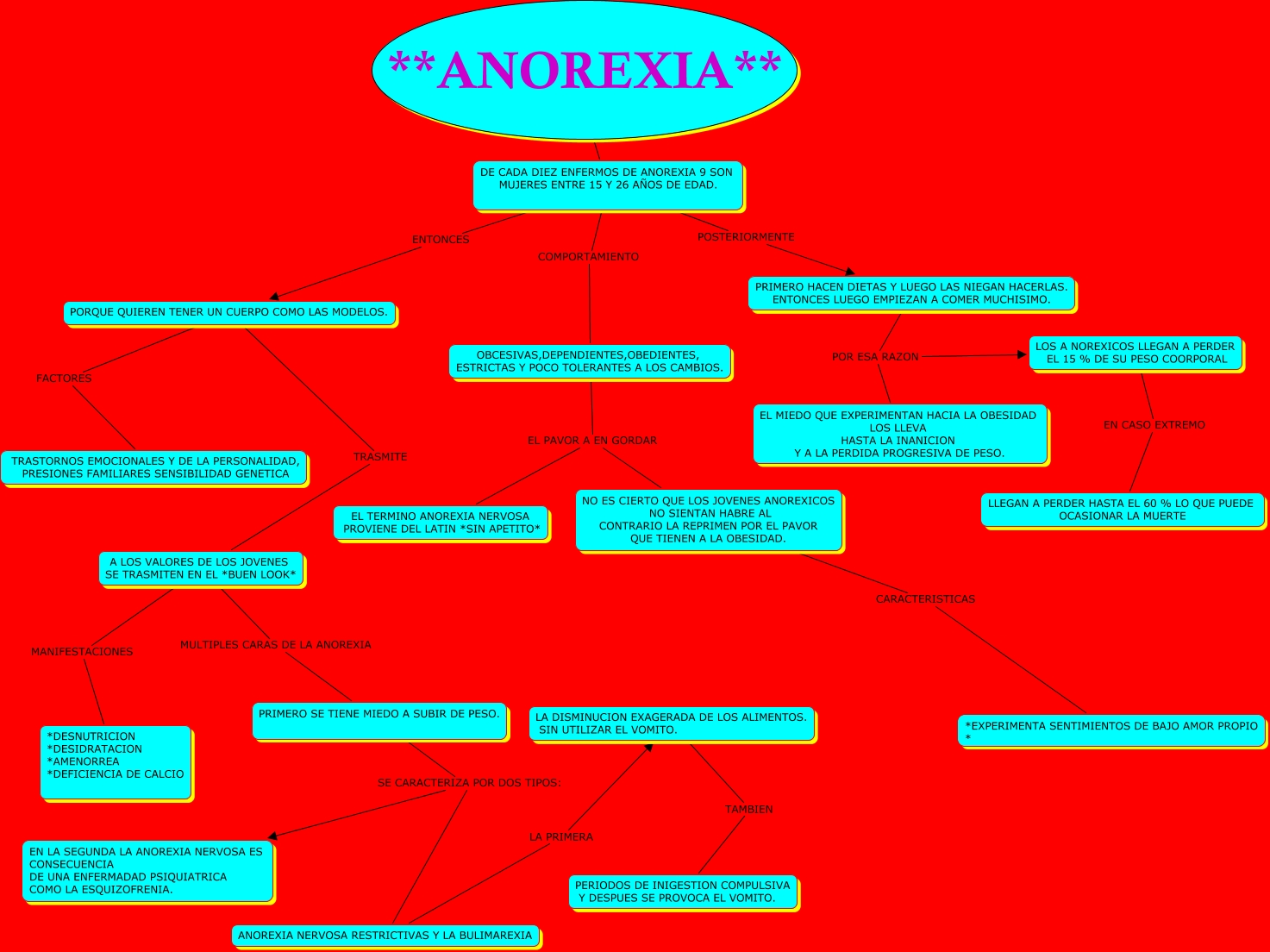 Este Cmap, tiene información relacionada con: ANOREXIA, NO ES CIERTO QUE LOS JOVENES ANOREXICOS NO SIENTAN HABRE AL CONTRARIO LA REPRIMEN POR EL PAVOR QUE TIENEN A LA OBESIDAD. CARACTERISTICAS *EXPERIMENTA SENTIMIENTOS DE BAJO AMOR PROPIO *, A LOS VALORES DE LOS JOVENES SE TRASMITEN EN EL *BUEN LOOK* MULTIPLES CARAS DE LA ANOREXIA PRIMERO SE TIENE MIEDO A SUBIR DE PESO., A LOS VALORES DE LOS JOVENES SE TRASMITEN EN EL *BUEN LOOK* MANIFESTACIONES *DESNUTRICION *DESIDRATACION *AMENORREA *DEFICIENCIA DE CALCIO, **ANOREXIA** ???? DE CADA DIEZ ENFERMOS DE ANOREXIA 9 SON MUJERES ENTRE 15 Y 26 AÑOS DE EDAD., PRIMERO SE TIENE MIEDO A SUBIR DE PESO. SE CARACTERIZA POR DOS TIPOS: EN LA SEGUNDA LA ANOREXIA NERVOSA ES CONSECUENCIA DE UNA ENFERMADAD PSIQUIATRICA COMO LA ESQUIZOFRENIA., ANOREXIA NERVOSA RESTRICTIVAS Y LA BULIMAREXIA LA PRIMERA LA DISMINUCION EXAGERADA DE LOS ALIMENTOS. SIN UTILIZAR EL VOMITO., DE CADA DIEZ ENFERMOS DE ANOREXIA 9 SON MUJERES ENTRE 15 Y 26 AÑOS DE EDAD. POSTERIORMENTE PRIMERO HACEN DIETAS Y LUEGO LAS NIEGAN HACERLAS. ENTONCES LUEGO EMPIEZAN A COMER MUCHISIMO., PORQUE QUIEREN TENER UN CUERPO COMO LAS MODELOS. TRASMITE A LOS VALORES DE LOS JOVENES SE TRASMITEN EN EL *BUEN LOOK*, OBCESIVAS,DEPENDIENTES,OBEDIENTES, ESTRICTAS Y POCO TOLERANTES A LOS CAMBIOS. EL PAVOR A EN GORDAR EL TERMINO ANOREXIA NERVOSA PROVIENE DEL LATIN *SIN APETITO*, DE CADA DIEZ ENFERMOS DE ANOREXIA 9 SON MUJERES ENTRE 15 Y 26 AÑOS DE EDAD. ENTONCES PORQUE QUIEREN TENER UN CUERPO COMO LAS MODELOS., LOS A NOREXICOS LLEGAN A PERDER EL 15 % DE SU PESO COORPORAL EN CASO EXTREMO LLEGAN A PERDER HASTA EL 60 % LO QUE PUEDE OCASIONAR LA MUERTE, LA DISMINUCION EXAGERADA DE LOS ALIMENTOS. SIN UTILIZAR EL VOMITO. TAMBIEN PERIODOS DE INIGESTION COMPULSIVA Y DESPUES SE PROVOCA EL VOMITO., OBCESIVAS,DEPENDIENTES,OBEDIENTES, ESTRICTAS Y POCO TOLERANTES A LOS CAMBIOS. EL PAVOR A EN GORDAR NO ES CIERTO QUE LOS JOVENES ANOREXICOS NO SIENTAN HABRE AL CONTRARIO LA REPRIMEN POR EL PAVOR QUE TIENEN A LA OBESIDAD., PORQUE QUIEREN TENER UN CUERPO COMO LAS MODELOS. FACTORES TRASTORNOS EMOCIONALES Y DE LA PERSONALIDAD, PRESIONES FAMILIARES SENSIBILIDAD GENETICA, DE CADA DIEZ ENFERMOS DE ANOREXIA 9 SON MUJERES ENTRE 15 Y 26 AÑOS DE EDAD. COMPORTAMIENTO OBCESIVAS,DEPENDIENTES,OBEDIENTES, ESTRICTAS Y POCO TOLERANTES A LOS CAMBIOS., PRIMERO SE TIENE MIEDO A SUBIR DE PESO. SE CARACTERIZA POR DOS TIPOS: ANOREXIA NERVOSA RESTRICTIVAS Y LA BULIMAREXIA, PRIMERO HACEN DIETAS Y LUEGO LAS NIEGAN HACERLAS. ENTONCES LUEGO EMPIEZAN A COMER MUCHISIMO. POR ESA RAZON EL MIEDO QUE EXPERIMENTAN HACIA LA OBESIDAD LOS LLEVA HASTA LA INANICION Y A LA PERDIDA PROGRESIVA DE PESO., PRIMERO HACEN DIETAS Y LUEGO LAS NIEGAN HACERLAS. ENTONCES LUEGO EMPIEZAN A COMER MUCHISIMO. POR ESA RAZON LOS A NOREXICOS LLEGAN A PERDER EL 15 % DE SU PESO COORPORAL