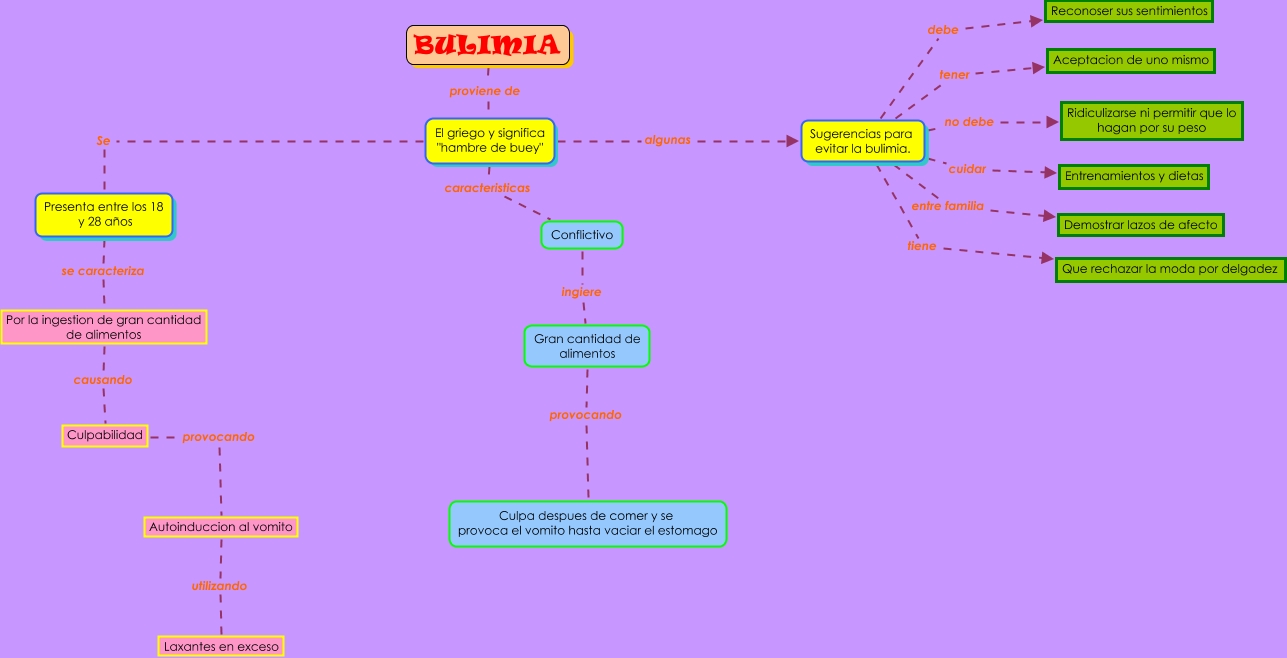 Este Cmap, tiene información relacionada con: Bulimia, El griego y significa "hambre de buey" caracteristicas Conflictivo, Sugerencias para evitar la bulimia. tiene Que rechazar la moda por delgadez, Sugerencias para evitar la bulimia. tener Aceptacion de uno mismo, Sugerencias para evitar la bulimia. no debe Ridiculizarse ni permitir que lo hagan por su peso, Conflictivo ingiere Gran cantidad de alimentos, Presenta entre los 18 y 28 años se caracteriza Por la ingestion de gran cantidad de alimentos, Gran cantidad de alimentos provocando Culpa despues de comer y se provoca el vomito hasta vaciar el estomago, Sugerencias para evitar la bulimia. entre familia Demostrar lazos de afecto, BULIMIA proviene de El griego y significa "hambre de buey", Por la ingestion de gran cantidad de alimentos causando Culpabilidad, Sugerencias para evitar la bulimia. cuidar Entrenamientos y dietas, Culpabilidad provocando Autoinduccion al vomito, Sugerencias para evitar la bulimia. debe Reconoser sus sentimientos, El griego y significa "hambre de buey" Se Presenta entre los 18 y 28 años, Autoinduccion al vomito utilizando Laxantes en exceso, El griego y significa "hambre de buey" algunas Sugerencias para evitar la bulimia.