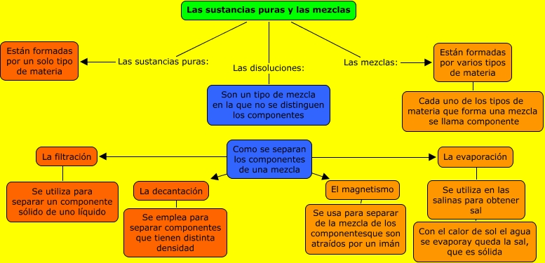 Este Cmap, tiene información relacionada con: Las sustancias puras y las mezclas, Como se separan los componentes de una mezcla ???? La decantación, Las sustancias puras y las mezclas Las mezclas: Están formadas por varios tipos de materia, Como se separan los componentes de una mezcla ???? La filtración, El magnetismo ???? Se usa para separar de la mezcla de los componentesque son atraídos por un imán, La evaporación ???? Se utiliza en las salinas para obtener sal, La filtración ???? Se utiliza para separar un componente sólido de uno líquido, Las sustancias puras y las mezclas Las disoluciones: Son un tipo de mezcla en la que no se distinguen los componentes, Las sustancias puras y las mezclas Las sustancias puras: Están formadas por un solo tipo de materia, Se utiliza en las salinas para obtener sal ???? Con el calor de sol el agua se evaporay queda la sal, que es sólida, Están formadas por varios tipos de materia ???? Cada uno de los tipos de materia que forma una mezcla se llama componente, Como se separan los componentes de una mezcla ???? El magnetismo, La decantación ???? Se emplea para separar componentes que tienen distinta densidad, Como se separan los componentes de una mezcla ???? La evaporación