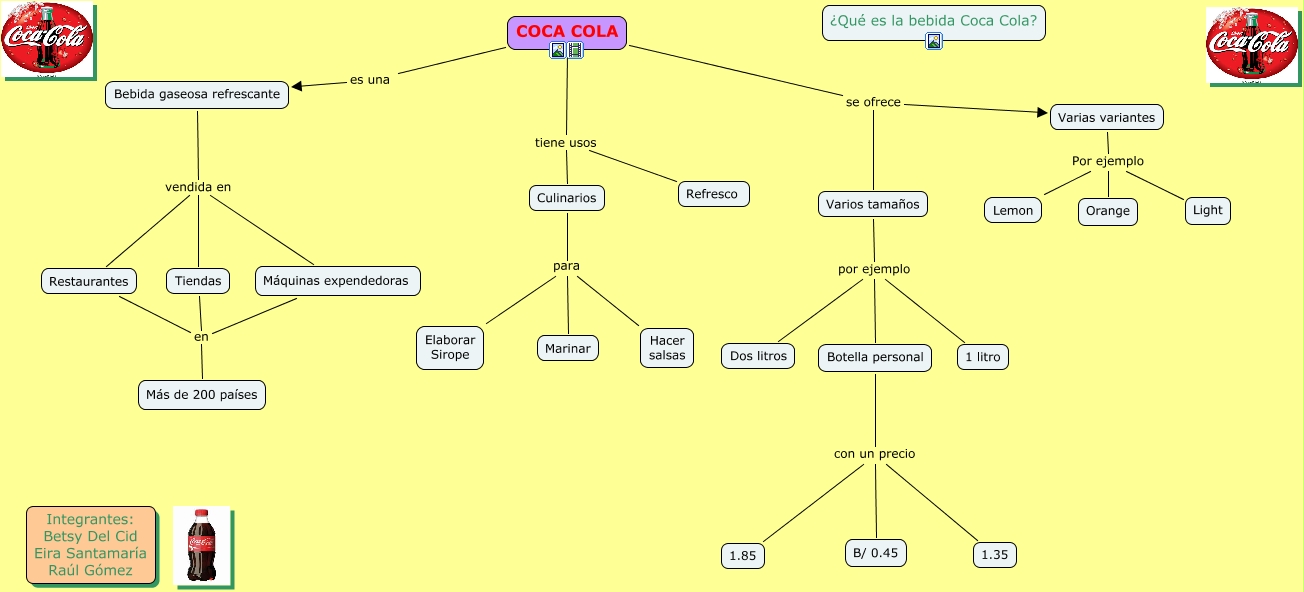 Este Cmap, tiene información relacionada con: Coca Cola, Varios tamaños por ejemplo 1 litro, Culinarios para Hacer salsas, Restaurantes en Más de 200 países, Varias variantes Por ejemplo Light, COCA COLA se ofrece Varios tamaños, Máquinas expendedoras en Más de 200 países, Varios tamaños por ejemplo Botella personal, COCA COLA tiene usos Refresco, Varios tamaños por ejemplo Dos litros, Bebida gaseosa refrescante vendida en Restaurantes, Bebida gaseosa refrescante vendida en Tiendas, Botella personal con un precio 1.85, Varias variantes Por ejemplo Lemon, COCA COLA tiene usos Culinarios, Botella personal con un precio 1.35, Bebida gaseosa refrescante vendida en Máquinas expendedoras, COCA COLA se ofrece Varias variantes, Culinarios para Elaborar Sirope, COCA COLA es una Bebida gaseosa refrescante, Varias variantes Por ejemplo Orange