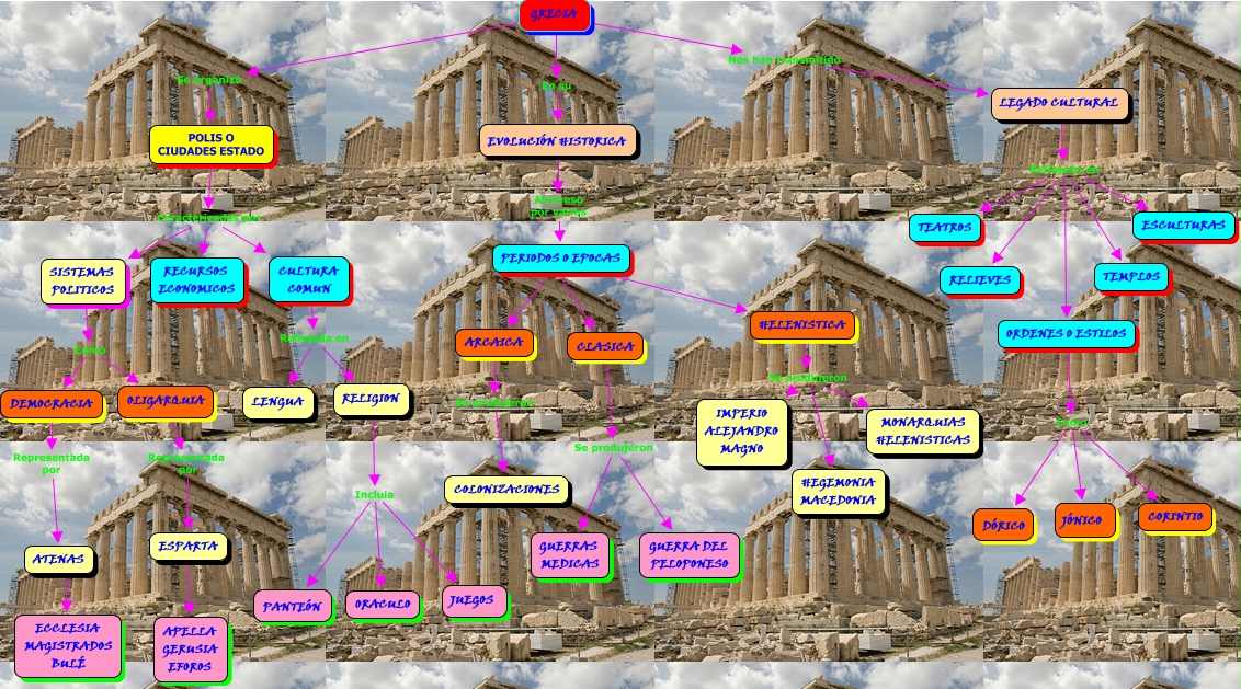 Este Cmap, tiene información relacionada con: GRECIA ESQUEMA, LEGADO CULTURAL Reflejado en ESCULTURAS, GRECIA Se organizo POLIS O CIUDADES ESTADO, HELENISTICA Se produjeron MONARQUIAS HELENISTICAS, SISTEMAS POLITICOS Como OLIGARQUIA, GRECIA En su EVOLUCIÓN HISTORICA, LEGADO CULTURAL Reflejado en ORDENES O ESTILOS, ORDENES O ESTILOS Como DÓRICO, DEMOCRACIA Representada por ATENAS, ESPARTA ???? APELLA GERUSIA EFOROS, POLIS O CIUDADES ESTADO Caracterizadas por RECURSOS ECONOMICOS, CULTURA COMUN Reflejada en LENGUA, SISTEMAS POLITICOS Como DEMOCRACIA, LEGADO CULTURAL Reflejado en TEATROS, HELENISTICA Se produjeron HEGEMONIA MACEDONIA, CLASICA Se produjeron GUERRA DEL PELOPONESO, PERIODOS O EPOCAS ???? HELENISTICA, ORDENES O ESTILOS Como JÓNICO, RELIGION Incluia JUEGOS, ORDENES O ESTILOS Como CORINTIO, POLIS O CIUDADES ESTADO Caracterizadas por SISTEMAS POLITICOS