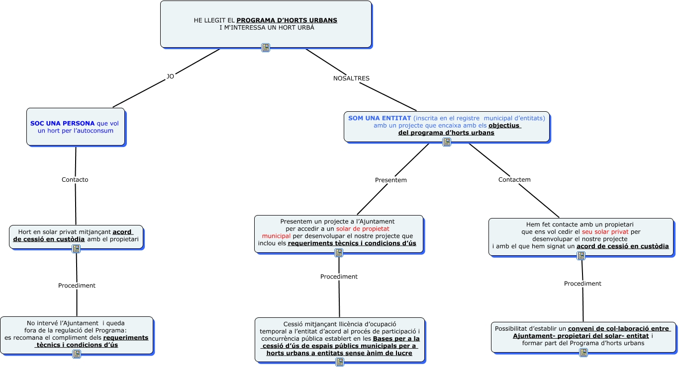 Este Cmap, tiene información relacionada con: Horts Urbans, SOC UNA PERSONA que vol un hort per l’autoconsum Contacto Hort en solar privat mitjançant acord de cessió en custòdia amb el propietari, HE LLEGIT EL PROGRAMA D’HORTS URBANS I M‘INTERESSA UN HORT URBÀ JO SOC UNA PERSONA que vol un hort per l’autoconsum, Presentem un projecte a l’Ajuntament per accedir a un solar de propietat municipal per desenvolupar el nostre projecte que inclou els requeriments tècnics i condicions d’ús Procediment Cessió mitjançant llicència d’ocupació temporal a l’entitat d’acord al procés de participació i concurrència pública establert en les Bases per a la cessió d’ús de espais públics municipals per a horts urbans a entitats sense ànim de lucre, SOM UNA ENTITAT (inscrita en el registre municipal d’entitats) amb un projecte que encaixa amb els objectius del programa d’horts urbans Contactem Hem fet contacte amb un propietari que ens vol cedir el seu solar privat per desenvolupar el nostre projecte i amb el que hem signat un acord de cessió en custòdia, SOM UNA ENTITAT (inscrita en el registre municipal d’entitats) amb un projecte que encaixa amb els objectius del programa d’horts urbans Presentem Presentem un projecte a l’Ajuntament per accedir a un solar de propietat municipal per desenvolupar el nostre projecte que inclou els requeriments tècnics i condicions d’ús, Hem fet contacte amb un propietari que ens vol cedir el seu solar privat per desenvolupar el nostre projecte i amb el que hem signat un acord de cessió en custòdia Procediment Possibilitat d’establir un conveni de col·laboració entre Ajuntament- propietari del solar- entitat i formar part del Programa d’horts urbans, HE LLEGIT EL PROGRAMA D’HORTS URBANS I M‘INTERESSA UN HORT URBÀ NOSALTRES SOM UNA ENTITAT (inscrita en el registre municipal d’entitats) amb un projecte que encaixa amb els objectius del programa d’horts urbans, Hort en solar privat mitjançant acord de cessió en custòdia amb el propietari Procediment No intervé l’Ajuntament i queda fora de la regulació del Programa: es recomana el compliment dels requeriments tècnics i condicions d’ús