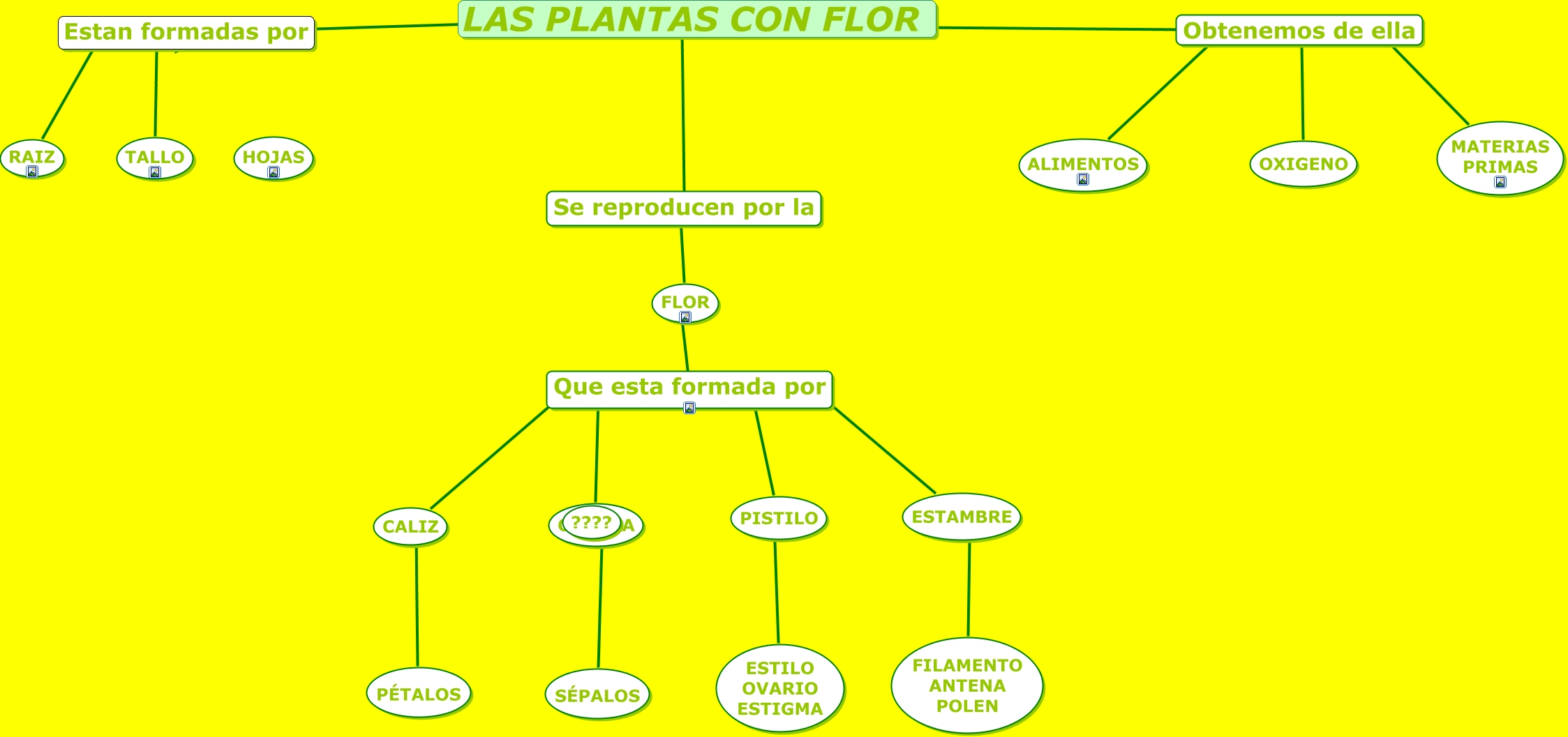 Este Cmap, tiene información relacionada con: las plantas con flor, FILAMENTO ANTENA POLEN ???? ESTAMBRE, PISTILO ???? Que esta formada por, MATERIAS PRIMAS ???? Obtenemos de ella, TALLO ???? Estan formadas por, Que esta formada por ???? FLOR, RAIZ ???? Estan formadas por, CALIZ ???? Que esta formada por, ESTAMBRE ???? Que esta formada por, Se reproducen por la ???? LAS PLANTAS CON FLOR, Estan formadas por ???? LAS PLANTAS CON FLOR, FLOR ???? Se reproducen por la, PÉTALOS ???? CALIZ, ESTAMBRE ???? Que esta formada por, OXIGENO ???? Obtenemos de ella, COROLA ???? Que esta formada por, ALIMENTOS ???? Obtenemos de ella, ESTILO OVARIO ESTIGMA ???? PISTILO, SÉPALOS ???? ????, Obtenemos de ella ???? LAS PLANTAS CON FLOR