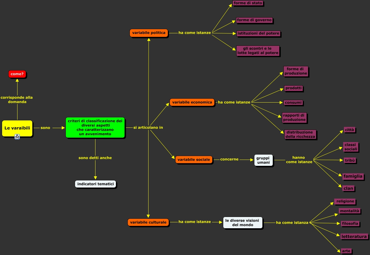 Le variabili, criteri di classificazione dei diversi aspetti che caratterizzano un avvenimento si articolano in variabile culturale, variabile economica ha come istanze distribuzione della ricchezza, le diverse visioni del mondo ha come istanza filosofia, le diverse visioni del mondo ha come istanza arte, gruppi umani hanno come istanze classi sociali, le diverse visioni del mondo ha come istanza religione, le diverse visioni del mondo ha come istanza mentalità, Le varaibili sono criteri di classificazione dei diversi aspetti che caratterizzano un avvenimento, gruppi umani hanno come istanze tribù, le diverse visioni del mondo ha come istanza religione
