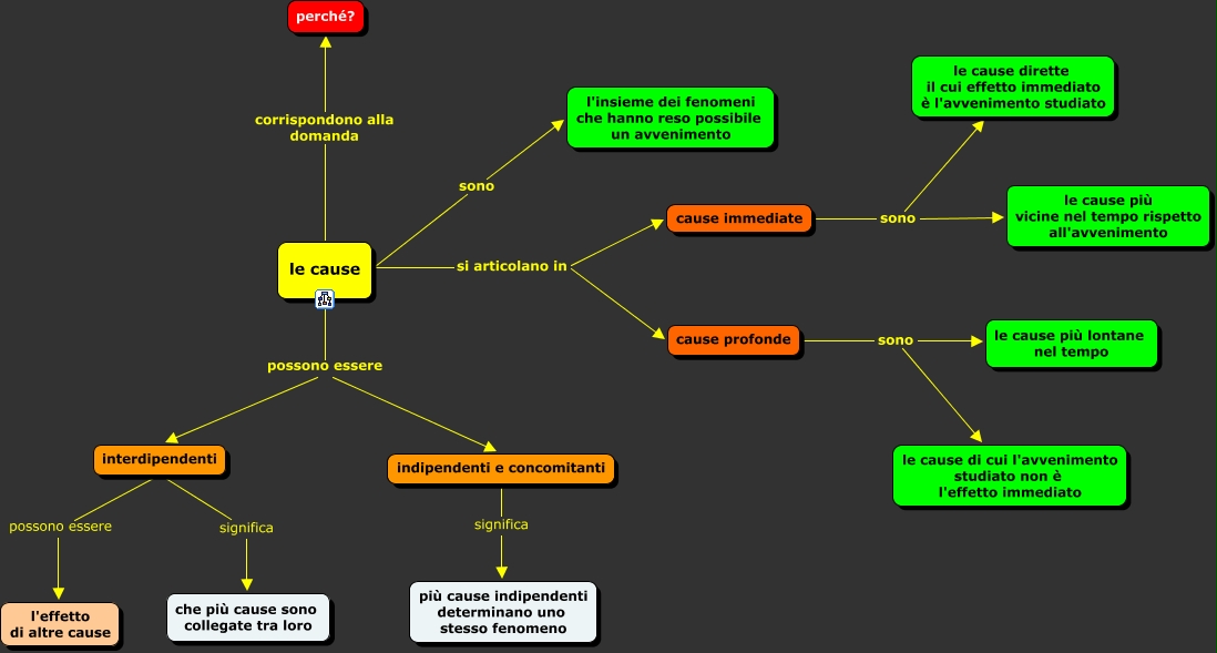 Le cause, cause immediate sono le cause dirette il cui effetto immediato è l'avvenimento studiato, le cause sono l'insieme dei fenomeni che hanno reso possibile un avvenimento, indipendenti e concomitanti significa più cause indipendenti determinano uno stesso fenomeno, cause profonde sono le cause più lontane nel tempo, interdipendenti possono essere l'effetto di altre cause, cause profonde sono le cause di cui l'avvenimento studiato non è l'effetto immediato, le cause si articolano in cause profonde, le cause corrispondono alla domanda perché?, le cause si articolano in cause immediate, le cause possono essere indipendenti e concomitanti