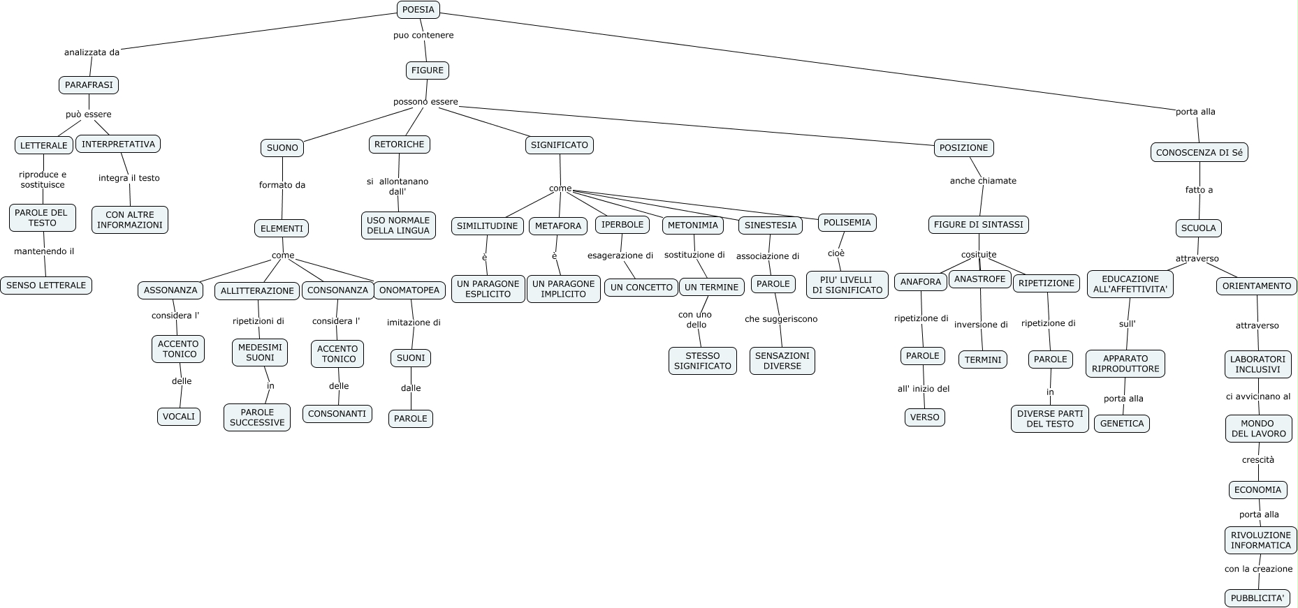 Questa Cmap, creata con IHMC CmapTools, contiene informazioni relative a: POESIA-MBIR, FIGURE possono essere SUONO, POSIZIONE anche chiamate FIGURE DI SINTASSI, LETTERALE riproduce e sostituisce PAROLE DEL TESTO, FIGURE possono essere POSIZIONE, SIGNIFICATO come SIMILITUDINE, PAROLE DEL TESTO mantenendo il SENSO LETTERALE, ORIENTAMENTO attraverso LABORATORI INCLUSIVI, PAROLE in DIVERSE PARTI DEL TESTO, SCUOLA attraverso ORIENTAMENTO, POLISEMIA cioè PIU' LIVELLI DI SIGNIFICATO, SUONO formato da ELEMENTI, PAROLE che suggeriscono SENSAZIONI DIVERSE, METAFORA è UN PARAGONE IMPLICITO, PARAFRASI può essere LETTERALE, MEDESIMI SUONI in PAROLE SUCCESSIVE, METONIMIA sostituzione di UN TERMINE, SUONI dalle PAROLE, FIGURE DI SINTASSI cosituite RIPETIZIONE, ANAFORA ripetizione di PAROLE, SIMILITUDINE è UN PARAGONE ESPLICITO