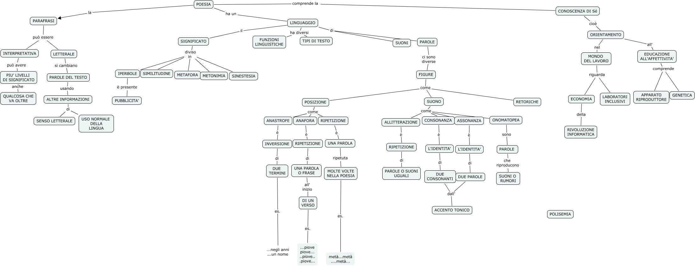 Questa Cmap, creata con IHMC CmapTools, contiene informazioni relative a: POESIA-PIU-PIU-WEJI-DEBI, INTERPRETATIVA può avere PIU' LIVELLI DI SIGNIFICATO, CONOSCENZA DI Sé cioè ORIENTAMENTO, DUE CONSONANTI dall' ACCENTO TONICO, RIPETIZIONE di UNA PAROLA O FRASE, PAROLE ci sono diverse FIGURE, LINGUAGGIO il SIGNIFICATO, POESIA la PARAFRASI, UNA PAROLA O FRASE all' inizio DI UN VERSO, POSIZIONE come RIPETIZIONE, SIGNIFICATO diviso in SINESTESIA, RIPETIZIONE è UNA PAROLA, PIU' LIVELLI DI SIGNIFICATO anche QUALCOSA CHE VA OLTRE, MONDO DEL LAVORO riguarda ECONOMIA, L'IDENTITA' di DUE PAROLE, DUE TERMINI es. ...negli anni ...un nome, EDUCAZIONE ALL'AFFETTIVITA' comprende APPARATO RIPRODUTTORE, ALTRE INFORMAZIONI di USO NORMALE DELLA LINGUA, IPERBOLE è presente PUBBLICITA', SUONO come ONOMATOPEA, EDUCAZIONE ALL'AFFETTIVITA' comprende GENETICA