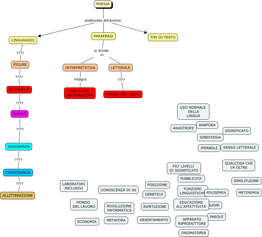 Questa Cmap, creata con IHMC CmapTools, contiene informazioni relative a: POESIA di Marianna e Nicholas, PARAFRASI si divide in LETTERALE, LINGUAGGIO ???? FIGURE, ASSONANZA ???? CONSONANZA, RETORICHE ???? SUONO, PARAFRASI si divide in INTERPRETATIVA, SUONO ???? ASSONANZA, POESIA analizzata attraverso TIPI DI TESTO, POESIA analizzata attraverso LINGUAGGIO, FIGURE ???? RETORICHE, LETTERALE ???? PAROLE DEL TESTO, INTERPRETATIVA integra CON ALTRE INFORMAZIONI, CONSONANZA ???? ALLITTERAZIONE, POESIA analizzata attraverso PARAFRASI