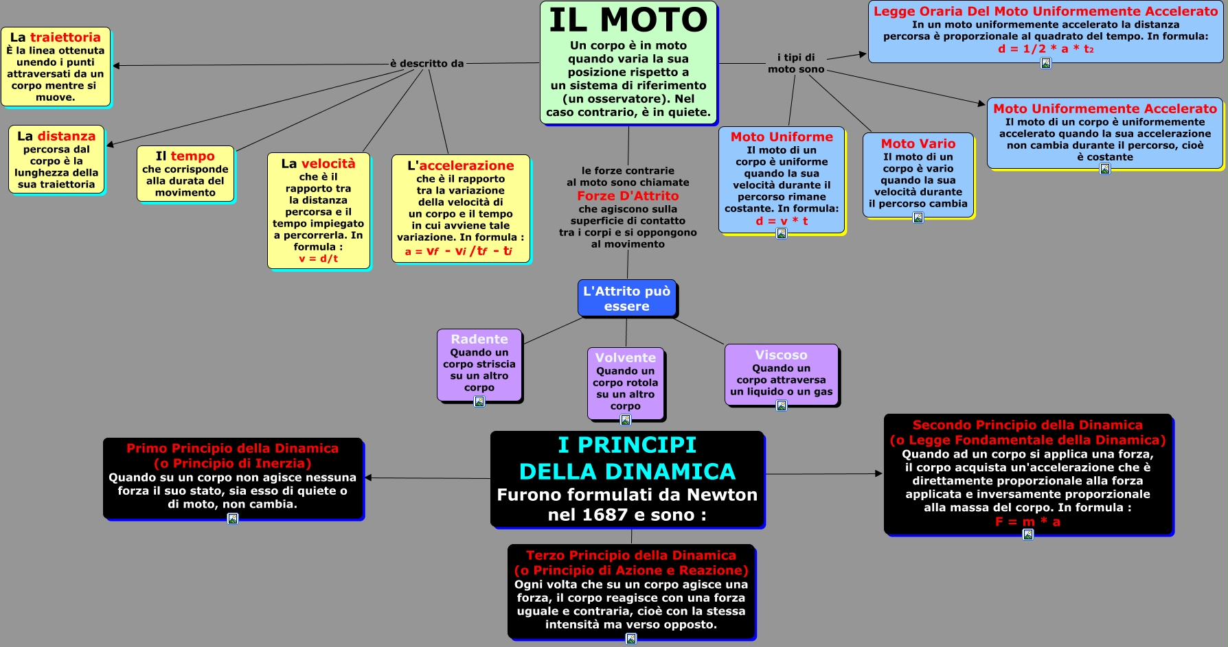 Questa Cmap, creata con IHMC CmapTools, contiene informazioni relative a: Il Moto ed I Principi della Dinamica (Cmap) (1), I PRINCIPI DELLA DINAMICA Furono formulati da Newton nel 1687 e sono : Terzo Principio della Dinamica (o Principio di Azione e Reazione) Ogni volta che su un corpo agisce una forza, il corpo reagisce con una forza uguale e contraria, cioè con la stessa intensità ma verso opposto., IL MOTO Un corpo è in moto quando varia la sua posizione rispetto a un sistema di riferimento (un osservatore). Nel caso contrario, è in quiete. le forze contrarie al moto sono chiamate Forze D'Attrito che agiscono sulla superficie di contatto tra i corpi e si oppongono al movimento L'Attrito può essere, I PRINCIPI DELLA DINAMICA Furono formulati da Newton nel 1687 e sono : Primo Principio della Dinamica (o Principio di Inerzia) Quando su un corpo non agisce nessuna forza il suo stato, sia esso di quiete o di moto, non cambia., L'Attrito può essere Volvente Quando un corpo rotola su un altro corpo, IL MOTO Un corpo è in moto quando varia la sua posizione rispetto a un sistema di riferimento (un osservatore). Nel caso contrario, è in quiete. i tipi di moto sono Legge Oraria Del Moto Uniformemente Accelerato In un moto uniformemente accelerato la distanza percorsa è proporzionale al quadrato del tempo. In formula: d = 1/2 * a * t2, I PRINCIPI DELLA DINAMICA Furono formulati da Newton nel 1687 e sono : Secondo Principio della Dinamica (o Legge Fondamentale della Dinamica) Quando ad un corpo si applica una forza, il corpo acquista un'accelerazione che è direttamente proporzionale alla forza applicata e inversamente proporzionale alla massa del corpo. In formula : F = m * a, IL MOTO Un corpo è in moto quando varia la sua posizione rispetto a un sistema di riferimento (un osservatore). Nel caso contrario, è in quiete. è descritto da La distanza percorsa dal corpo è la lunghezza della sua traiettoria, IL MOTO Un corpo è in moto quando varia la sua posizione rispetto a un sistema di riferimento (un osservatore). Nel caso contrario, è in quiete. i tipi di moto sono Moto Vario Il moto di un corpo è vario quando la sua velocità durante il percorso cambia, IL MOTO Un corpo è in moto quando varia la sua posizione rispetto a un sistema di riferimento (un osservatore). Nel caso contrario, è in quiete. i tipi di moto sono Moto Uniformemente Accelerato Il moto di un corpo è uniformemente accelerato quando la sua accelerazione non cambia durante il percorso, cioè è costante, IL MOTO Un corpo è in moto quando varia la sua posizione rispetto a un sistema di riferimento (un osservatore). Nel caso contrario, è in quiete. i tipi di moto sono Moto Uniforme Il moto di un corpo è uniforme quando la sua velocità durante il percorso rimane costante. In formula: d = v * t, IL MOTO Un corpo è in moto quando varia la sua posizione rispetto a un sistema di riferimento (un osservatore). Nel caso contrario, è in quiete. è descritto da L'accelerazione che è il rapporto tra la variazione della velocità di un corpo e il tempo in cui avviene tale variazione. In formula : a = vf - vi/tf - ti, IL MOTO Un corpo è in moto quando varia la sua posizione rispetto a un sistema di riferimento (un osservatore). Nel caso contrario, è in quiete. è descritto da Il tempo che corrisponde alla durata del movimento, IL MOTO Un corpo è in moto quando varia la sua posizione rispetto a un sistema di riferimento (un osservatore). Nel caso contrario, è in quiete. è descritto da La traiettoria È la linea ottenuta unendo i punti attraversati da un corpo mentre si muove., L'Attrito può essere Viscoso Quando un corpo attraversa un liquido o un gas, L'Attrito può essere Radente Quando un corpo striscia su un altro corpo, IL MOTO Un corpo è in moto quando varia la sua posizione rispetto a un sistema di riferimento (un osservatore). Nel caso contrario, è in quiete. è descritto da La velocità che è il rapporto tra la distanza percorsa e il tempo impiegato a percorrerla. In formula : v = d/t