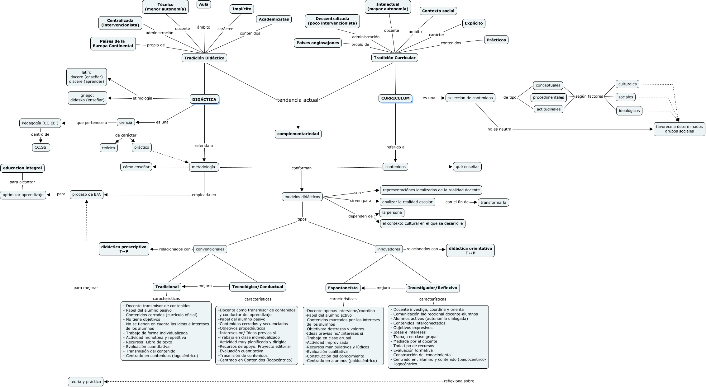 Este Cmap, tiene información relacionada con: didactica, Tecnológico/Conductual características -Docente como transmisor de contenidos y conductor del aprendizaje -Papel del alumno pasivo -Contenidos cerrados y secuenciados -Objetivos propedéuticos -Intereses no/ Ideas previas si -Trabajo en clase individualizado -Actividad muy planificada y dirigida -Recursos de apoyo. Proyecto editorial -Evaluación cuantitativa -Trasmisión de contenidos -Centrado en Contenidos (logocéntrico), actitudinales según factores culturales, ideológicos favorece a determinados grupos sociales, ciencia que pertenece a Pedagogía (CC.EE.), conceptuales según factores ideológicos, Investigador/Reflexivo reflexiona sobre teoría y práctica, DIDÁCTICA etimología latín: docere (enseñar) discere (aprender), innovadores Investigador/Reflexivo, procedimentales según factores culturales, práctico metodología, Espontaneísta características -Docente apenas interviene/coordina -Papel del alumno activo -Contenidos marcados por los intereses de los alumnos -Objetivos: destrezas y valores. -Ideas previas no/ Intereses si -Trabajo en clase grupal -Actividad improvisada -Recursos manipulativos y lúdicos -Evaluación cualitativa -Construcción del conocimiento -Centrado en alumnos (paidocéntrico), Pedagogía (CC.EE.) dentro de CC.SS., Tradición Didáctica docente Técnico (menor autonomía), actitudinales según factores ideológicos, Tradición Curricular carácter Explícito, Investigador/Reflexivo mejora Espontaneísta, convencionales tipos innovadores, selección de contenidos de tipo conceptuales, actitudinales según factores sociales, modelos didácticos son representaciónes idealizadas de la realidad docente