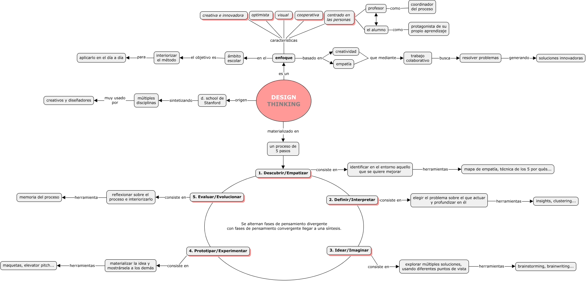 Este Cmap, tiene información relacionada con: el nuevo cmap de Design Thinking, DESIGN THINKING es un enfoque, enfoque características cooperativa, elegir el problema sobre el que actuar y profundizar en él herramientas insights, clustering..., 3. Idear/Imaginar consiste en explorar múltiples soluciones, usando diferentes puntos de vista, DESIGN THINKING materializado en un proceso de 5 pasos, d. school de Stanford sintetizando múltiples disciplinas, enfoque basado en empatía, el alumno profesor, materializar la idea y mostrársela a los demás herramientas maquetas, elevator pitch..., trabajo colaborativo busca resolver problemas, profesor como coordinador del proceso, reflexionar sobre el proceso e interiorizarlo herramienta memoria del proceso, 5. Evaluar/Evolucionar consiste en reflexionar sobre el proceso e interiorizarlo, enfoque características optimista, un proceso de 5 pasos 1. Descubrir/Empatizar, enfoque en el ámbito escolar, enfoque características visual, el alumno centrado en las personas, 1. Descubrir/Empatizar consiste en identificar en el entorno aquello que se quiere mejorar, enfoque características creativa e innovadora