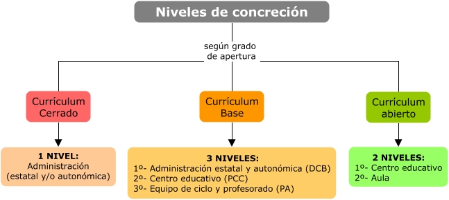 Este Cmap, tiene información relacionada con: niveles de apertura, Niveles de concreción según grado de apertura Currículum Base, Currículum Base 3 NIVELES: 1º- Administración estatal y autonómica (DCB) 2º- Centro educativo (PCC) 3º- Equipo de ciclo y profesorado (PA), Currículum Cerrado 1 NIVEL: Administración (estatal y/o autonómica), Currículum abierto 2 NIVELES: 1º- Centro educativo 2º- Aula, Niveles de concreción según grado de apertura Currículum abierto, Niveles de concreción según grado de apertura Currículum Cerrado