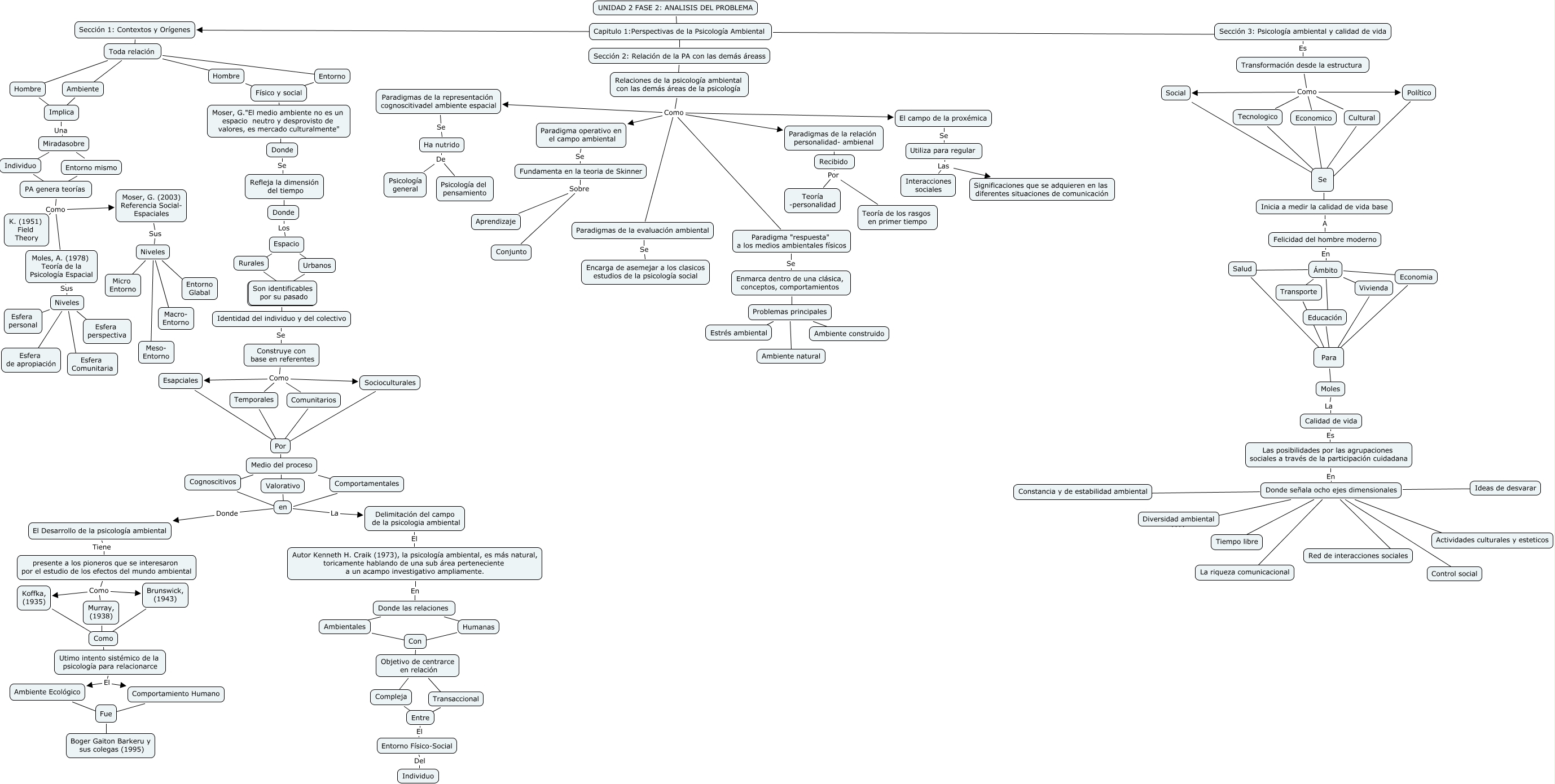Este Cmap, tiene información relacionada con: Capitulo 1. Perspectivas de la Psicología Ambiental, Rurales ???? Son identificables por su pasado, Construye con base en referentes Como Comunitarios, Político ???? Se, Sección 2: Relación de la PA con las demás áreass ???? Relaciones de la psicología ambiental con las demás áreas de la psicología, Transformación desde la estructura Como Economico, Vivienda ???? Para, Ámbito ???? Salud, Como ???? Utimo intento sistémico de la psicología para relacionarce, Espacio ???? Rurales, Moser, G."El medio ambiente no es un espacio neutro y desprovisto de valores, es mercado culturalmente" ???? Donde, Ambientales ???? Con, PA genera teorías Como Moles, A. (1978) Teoría de la Psicología Espacial, Cognoscitivos ???? en, Valorativo ???? en, en Donde El Desarrollo de la psicología ambiental, Transformación desde la estructura Como Político, Físico y social ???? Moser, G."El medio ambiente no es un espacio neutro y desprovisto de valores, es mercado culturalmente", Entre El Entorno Físico-Social, Utimo intento sistémico de la psicología para relacionarce El Ambiente Ecológico, Donde señala ocho ejes dimensionales ???? Actividades culturales y esteticos
