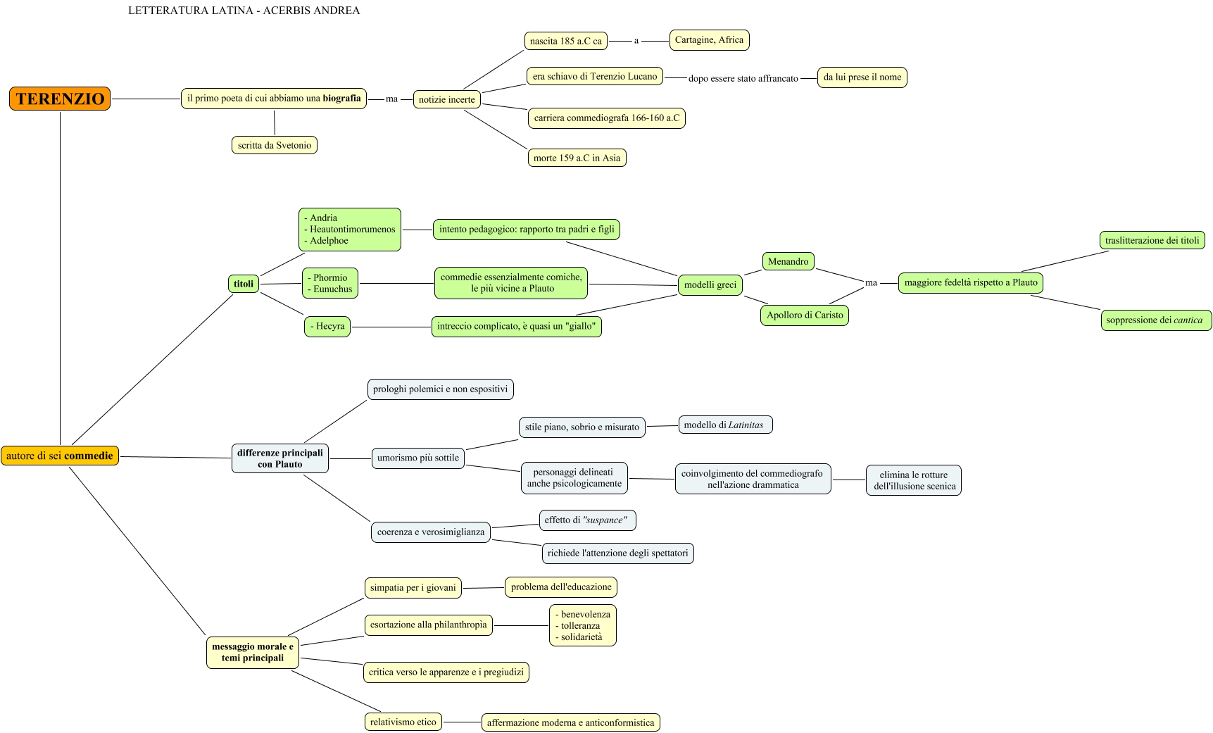 Questa Cmap, creata con IHMC CmapTools, contiene informazioni relative a: Terenzio - Acerbis Andrea, autore di sei commedie titoli, maggiore fedeltà rispetto a Plauto traslitterazione dei titoli, messaggio morale e temi principali critica verso le apparenze e i pregiudizi, coinvolgimento del commediografo nell'azione drammatica elimina le rotture dell'illusione scenica, coerenza e verosimiglianza effetto di "suspance", era schiavo di Terenzio Lucano dopo essere stato affrancato da lui prese il nome, esortazione alla philanthropìa - benevolenza - tolleranza - solidarietà, messaggio morale e temi principali relativismo etico, relativismo etico affermazione moderna e anticonformistica, titoli - Hecyra, intreccio complicato, è quasi un "giallo" modelli greci, umorismo più sottile personaggi delineati anche psicologicamente, umorismo più sottile stile piano, sobrio e misurato, notizie incerte era schiavo di Terenzio Lucano, Apolloro di Caristo ma maggiore fedeltà rispetto a Plauto, TERENZIO il primo poeta di cui abbiamo una biografia, differenze principali con Plauto prologhi polemici e non espositivi, titoli - Andria - Heautontimorumenos - Adelphoe, modelli greci Apolloro di Caristo, - Hecyra intreccio complicato, è quasi un "giallo"