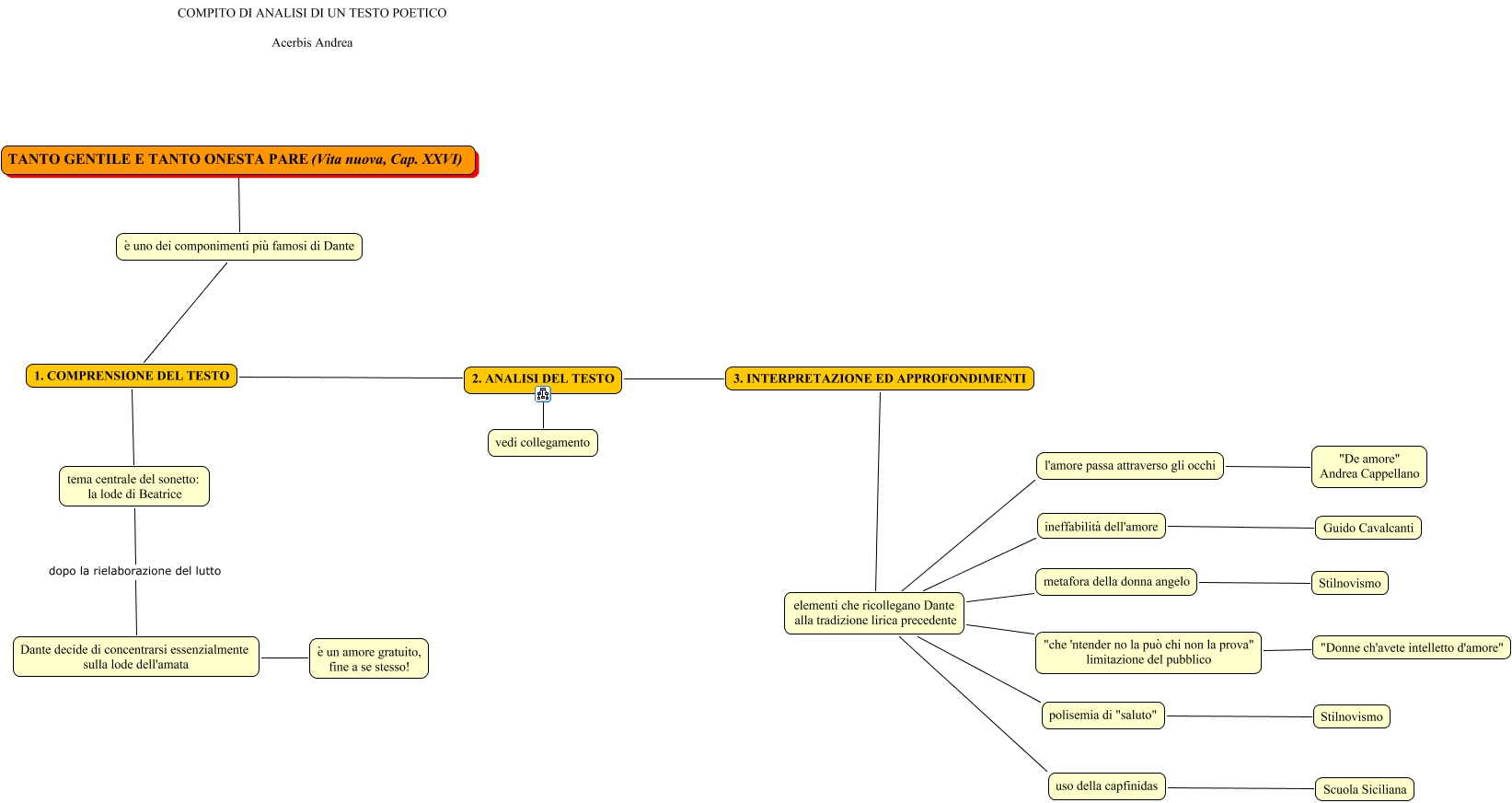 Questa Cmap, creata con IHMC CmapTools, contiene informazioni relative a: Tanto gentile e tanto onesta pare - Acerbis Andrea, Dante decide di concentrarsi essenzialmente sulla lode dell'amata è un amore gratuito, fine a se stesso!, elementi che ricollegano Dante alla tradizione lirica precedente ineffabilità dell'amore, elementi che ricollegano Dante alla tradizione lirica precedente "che 'ntender no la può chi non la prova" limitazione del pubblico, elementi che ricollegano Dante alla tradizione lirica precedente l'amore passa attraverso gli occhi, metafora della donna angelo Stilnovismo, elementi che ricollegano Dante alla tradizione lirica precedente metafora della donna angelo, 2. ANALISI DEL TESTO vedi collegamento, TANTO GENTILE E TANTO ONESTA PARE (Vita nuova, Cap. XXVI) è uno dei componimenti più famosi di Dante, ineffabilità dell'amore Guido Cavalcanti, 2. ANALISI DEL TESTO 3. INTERPRETAZIONE ED APPROFONDIMENTI, "che 'ntender no la può chi non la prova" limitazione del pubblico "Donne ch'avete intelletto d'amore", uso della capfinidas Scuola Siciliana, l'amore passa attraverso gli occhi "De amore" Andrea Cappellano, è uno dei componimenti più famosi di Dante 1. COMPRENSIONE DEL TESTO, tema centrale del sonetto: la lode di Beatrice dopo la rielaborazione del lutto Dante decide di concentrarsi essenzialmente sulla lode dell'amata, 1. COMPRENSIONE DEL TESTO 2. ANALISI DEL TESTO, 3. INTERPRETAZIONE ED APPROFONDIMENTI elementi che ricollegano Dante alla tradizione lirica precedente, 1. COMPRENSIONE DEL TESTO tema centrale del sonetto: la lode di Beatrice, polisemia di "saluto" Stilnovismo, elementi che ricollegano Dante alla tradizione lirica precedente polisemia di "saluto"