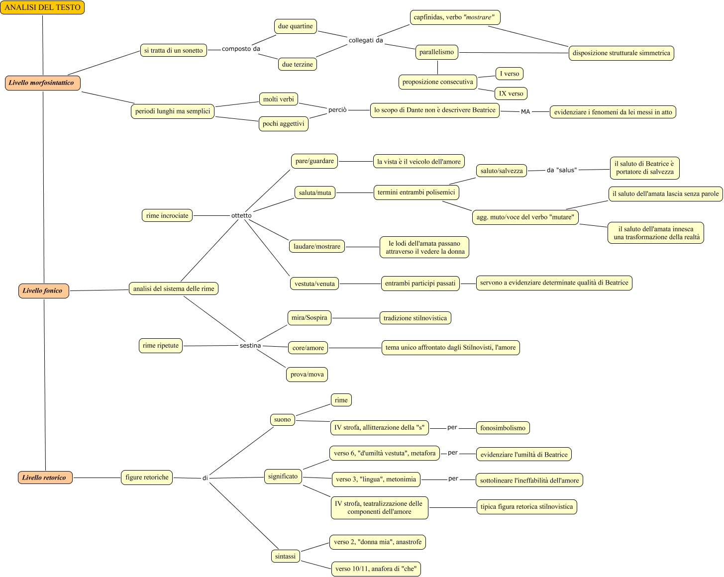 Questa Cmap, creata con IHMC CmapTools, contiene informazioni relative a: ACERBIS ANDREA Collegamento analisi Tanto gentile e tanto onesta pare, analisi del sistema delle rime ottetto pare/guardare, agg. muto/voce del verbo "mutare" il saluto dell'amata lascia senza parole, analisi del sistema delle rime ottetto saluta/muta, analisi del sistema delle rime sestina rime ripetute, lo scopo di Dante non è descrivere Beatrice MA evidenziare i fenomeni da lei messi in atto, laudare/mostrare le lodi dell'amata passano attraverso il vedere la donna, proposizione consecutiva I verso, periodi lunghi ma semplici molti verbi, termini entrambi polisemici agg. muto/voce del verbo "mutare", due terzine collegati da parallelismo, pare/guardare la vista è il veicolo dell'amore, significato verso 6, "d'umiltà vestuta", metafora, vestuta/venuta entrambi participi passati, Livello fonico analisi del sistema delle rime, entrambi participi passati servono a evidenziare determinate qualità di Beatrice, si tratta di un sonetto composto da due quartine, figure retoriche di suono, figure retoriche di significato, termini entrambi polisemici saluto/salvezza, parallelismo proposizione consecutiva