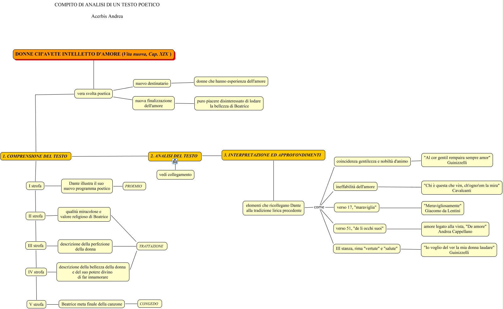 Questa Cmap, creata con IHMC CmapTools, contiene informazioni relative a: ACERBIS ANDREA Donne ch'avete intelletto d'amore, IV strofa descrizione della bellezza della donna e del suo potere divino di far innamorare, descrizione della perfezione della donna TRATTAZIONE, elementi che ricollegano Dante alla tradizione lirica precedente come ineffabilità dell'amore, III strofa IV strofa, III strofa descrizione della perfezione della donna, Dante illustra il suo nuovo programma poetico PROEMIO, vera svolta poetica nuova finalizzazione dell'amore, nuovo destinatario donne che hanno esperienza dell'amore, III stanza, rima "vertute" e "salute" "Io voglio del ver la mia donna laudare" Guinizzelli, verso 17, "maraviglia" "Meravigliosamente" Giacomo da Lentini, 2. ANALISI DEL TESTO 3. INTERPRETAZIONE ED APPROFONDIMENTI, 3. INTERPRETAZIONE ED APPROFONDIMENTI elementi che ricollegano Dante alla tradizione lirica precedente, elementi che ricollegano Dante alla tradizione lirica precedente come verso 17, "maraviglia", IV strofa V strofa, V strofa Beatrice meta finale della canzone, nuova finalizzazione dell'amore puro piacere disinteressato di lodare la bellezza di Beatrice, coincidenza gentilezza e nobiltà d'animo "Al cor gentil rempaira sempre amor" Guinizzelli, elementi che ricollegano Dante alla tradizione lirica precedente come coincidenza gentilezza e nobiltà d'animo, Beatrice meta finale della canzone CONGEDO, elementi che ricollegano Dante alla tradizione lirica precedente come III stanza, rima "vertute" e "salute"