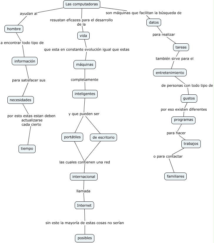 Este Cmap, tiene información relacionada con: cmap-lascomputadoras, gustos por eso existen diferentes programas, necesidades por esto estas estan deben actualizarse cada cierto tiempo, inteligentes y que pueden ser de escritorio, Las computadoras son máquinas que facilitan la búsqueda de datos, entretenimiento de personas con todo tipo de gustos, Las computadoras resustan eficazes para el desarrollo de la vida, vida que esta en constante evolución igual que estas máquinas, máquinas completamente inteligentes, Las computadoras ayudan al hombre, de escritorio las cuales contienen una red internacional, tareas también sirve para el entretenimiento, información para satisfacer sus necesidades, trabajos o para contactar familiares, inteligentes y que pueden ser portátiles, hombre a encontrar todo tipo de información, portátiles las cuales contienen una red internacional, programas para hacer trabajos, internacional llamada Internet, Internet sin este la mayoría de estas cosas no serían posibles, datos para realizar tareas