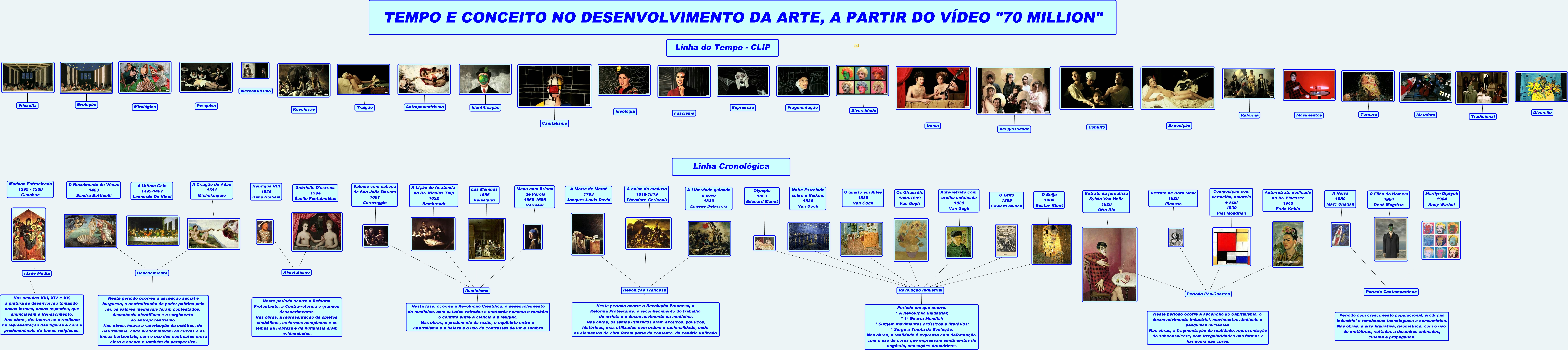 Esse mapa conceitual, produzido no IHMC CmapTools, tem a informação relacionada a: Tempo e conceito no desenvolvimento da arte, a partir do video 70 million, Noite Estrelada sobre o Ródano 1888 Van Gogh ????, Idade Média ???? Nos séculos XIII, XIV e XV, a pintura se desenvolveu tomando novas formas, novos aspectos, que anunciavam o Renascimento. Nas obras, destacava-se o realismo na representação das figuras e com a predominância de temas religiosos., ???? Iluminismo, ???? Iluminismo, ???? Diversão, ???? Revolução, Marilyn Diptych 1964 Andy Warhol ????, Os Girassóis 1888-1889 Van Gogh ????, Moça com Brinco de Pérola 1665-1666 Vermeer ????, Gabrielle D'estress 1594 Écolle Fontainebleu ????, O Filho do Homem 1964 René Magritte ????, ???? Conflito, Renascimento ???? Neste período ocorreu a ascenção social e burguesa, a centralização do poder político pelo rei, os valores medievais foram contestados, descoberta científicas e o surgimento do antropocentrismo. Nas obras, houve a valorização da estética, do naturalismo, onde predominavam as curvas e as linhas horizontais, com o uso dos contrsates entre claro e escuro e também da perspectiva., Iluminismo ???? Nesta fase, ocorreu a Revolução Científica, o desenvolvimento da medicina, com estudos voltados a anatomia humana e também o conflito entre a ciência e a religião. Nas obras, o predomínio da razão, o equilíbrio entre o naturalismo e a beleza e o uso de contrastes de luz e sombra, ???? Período Pós-Guerras, O Beijo 1908 Gustav Klimt ????, Idade Média ????, ???? Período Contemporâneo, Las Meninas 1656 Velasquez ????, ???? Mercantilismo