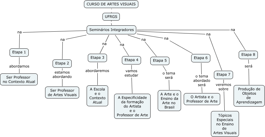 Esse mapa conceitual, produzido no IHMC CmapTools, tem a informação relacionada a: Seminários Integradores do Curso de Artes Visuais, Seminários Integradores na Etapa 5, Etapa 4 vamos estudar A Especificidade da formação do Artista e o Professor de Arte, Seminários Integradores na Etapa 3, Seminários Integradores na Etapa 6, Etapa 2 estamos abordando Ser Professor de Artes Visuais, Etapa 1 abordamos Ser Professor no Contexto Atual, Seminários Integradores na Etapa 8, Seminários Integradores na Etapa 4, UFRGS Seminários Integradores, Seminários Integradores na Etapa 7, Etapa 8 será Produção de Objetos de Aprendizagem, CURSO DE ARTES VISUAIS UFRGS, Etapa 7 veremos sobre Tópicos Especiais no Ensino de Artes Visuais, Seminários Integradores na Etapa 2, Etapa 3 abordaremos A Escola e o Contexto Atual, Seminários Integradores na Etapa 1, Etapa 6 o tema abordado será O Artista e o Professor de Arte, Etapa 5 o tema será A Arte e o Ensino da Arte no Brasil