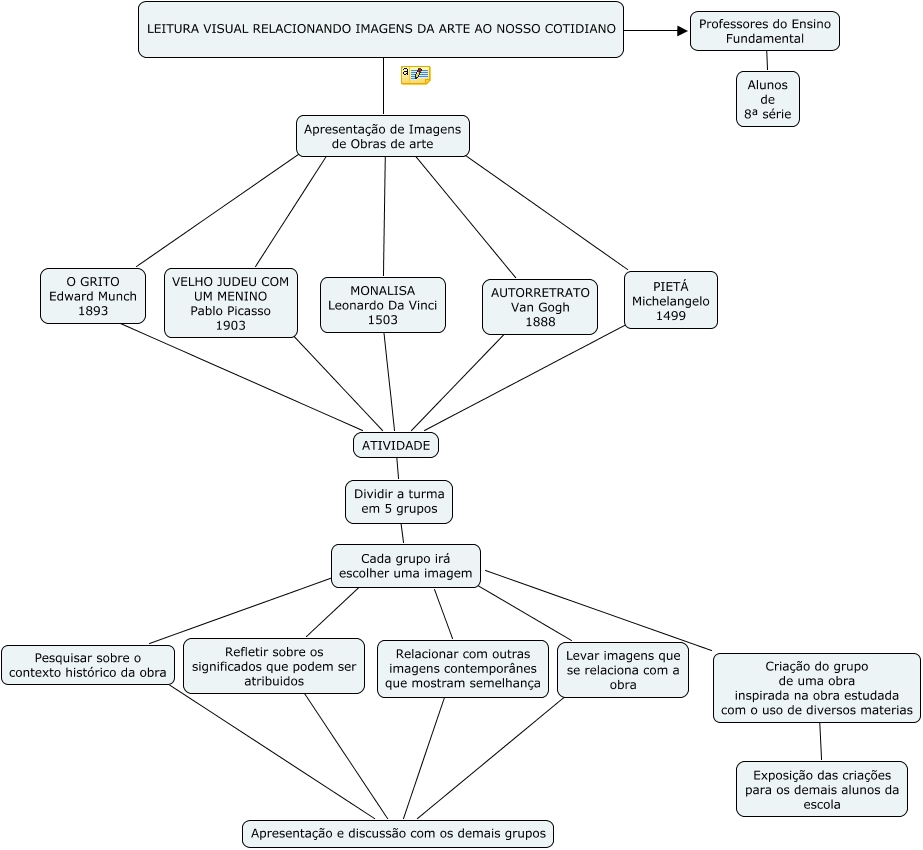 Esse mapa conceitual, produzido no IHMC CmapTools, tem a informação relacionada a: LEITURA VISUAL E A RELAÇÃO COM A ARTE EM NOSSO COTIDIANO, Levar imagens que se relaciona com a obra ???? Apresentação e discussão com os demais grupos, AUTORRETRATO Van Gogh 1888 ???? ATIVIDADE, Apresentação de Imagens de Obras de arte ???? PIETÁ Michelangelo 1499, Cada grupo irá escolher uma imagem ???? Relacionar com outras imagens contemporânes que mostram semelhança, Relacionar com outras imagens contemporânes que mostram semelhança ???? Apresentação e discussão com os demais grupos, Apresentação de Imagens de Obras de arte ???? AUTORRETRATO Van Gogh 1888, Dividir a turma em 5 grupos ???? Cada grupo irá escolher uma imagem, O GRITO Edward Munch 1893 ???? ATIVIDADE, Refletir sobre os significados que podem ser atribuidos ???? Apresentação e discussão com os demais grupos, Professores do Ensino Fundamental ???? Alunos de 8ª série, Apresentação de Imagens de Obras de arte ???? VELHO JUDEU COM UM MENINO Pablo Picasso 1903, Criação do grupo de uma obra inspirada na obra estudada com o uso de diversos materias ???? Exposição das criações para os demais alunos da escola, LEITURA VISUAL RELACIONANDO IMAGENS DA ARTE AO NOSSO COTIDIANO ???? Apresentação de Imagens de Obras de arte, MONALISA Leonardo Da Vinci 1503 ???? ATIVIDADE, LEITURA VISUAL RELACIONANDO IMAGENS DA ARTE AO NOSSO COTIDIANO ???? Professores do Ensino Fundamental, ATIVIDADE ???? Dividir a turma em 5 grupos, Apresentação de Imagens de Obras de arte ???? O GRITO Edward Munch 1893, VELHO JUDEU COM UM MENINO Pablo Picasso 1903 ???? ATIVIDADE, PIETÁ Michelangelo 1499 ???? ATIVIDADE, Cada grupo irá escolher uma imagem ???? Pesquisar sobre o contexto histórico da obra