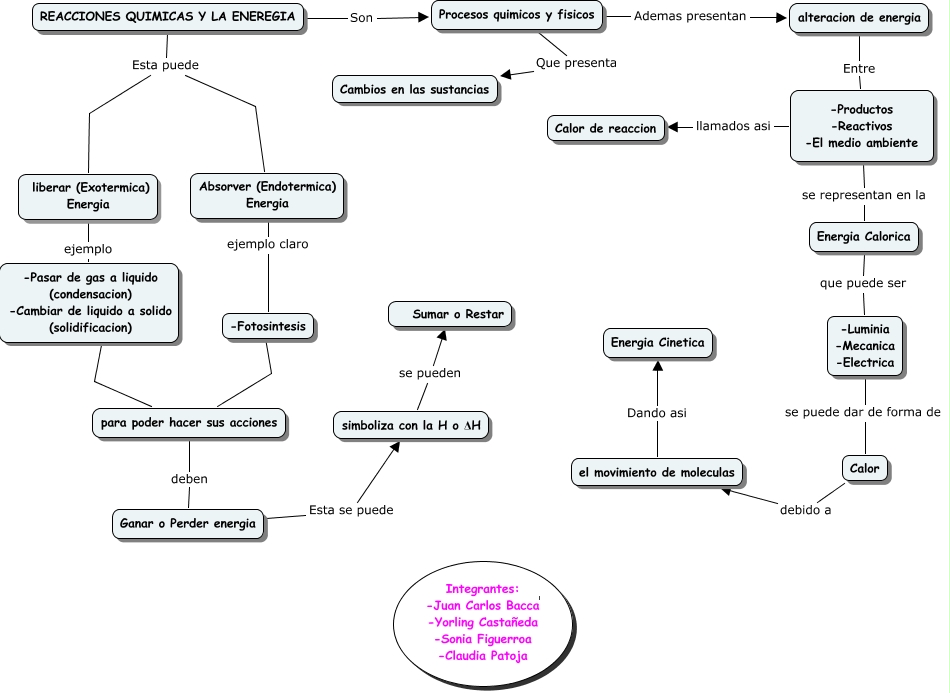 Este Cmap, tiene información relacionada con: Reacciones quimicas y la energia, Ganar o Perder energia Esta se puede simboliza con la H o ΔH, -Productos -Reactivos -El medio ambiente se representan en la Energia Calorica, para poder hacer sus acciones ???? -Pasar de gas a liquido (condensacion) -Cambiar de liquido a solido (solidificacion), el movimiento de moleculas Dando asi Energia Cinetica, -Fotosintesis ???? para poder hacer sus acciones, Procesos quimicos y fisicos Que presenta Cambios en las sustancias, -Luminia -Mecanica -Electrica se puede dar de forma de Calor, -Productos -Reactivos -El medio ambiente llamados asi Calor de reaccion, liberar (Exotermica) Energia ejemplo -Pasar de gas a liquido (condensacion) -Cambiar de liquido a solido (solidificacion), REACCIONES QUIMICAS Y LA ENEREGIA Son Procesos quimicos y fisicos, REACCIONES QUIMICAS Y LA ENEREGIA Esta puede Absorver (Endotermica) Energia, Procesos quimicos y fisicos Ademas presentan alteracion de energia, alteracion de energia Entre -Productos -Reactivos -El medio ambiente, REACCIONES QUIMICAS Y LA ENEREGIA Esta puede liberar (Exotermica) Energia, simboliza con la H o ΔH se pueden Sumar o Restar, Energia Calorica que puede ser -Luminia -Mecanica -Electrica, para poder hacer sus acciones deben Ganar o Perder energia, Absorver (Endotermica) Energia ejemplo claro -Fotosintesis, Calor debido a el movimiento de moleculas