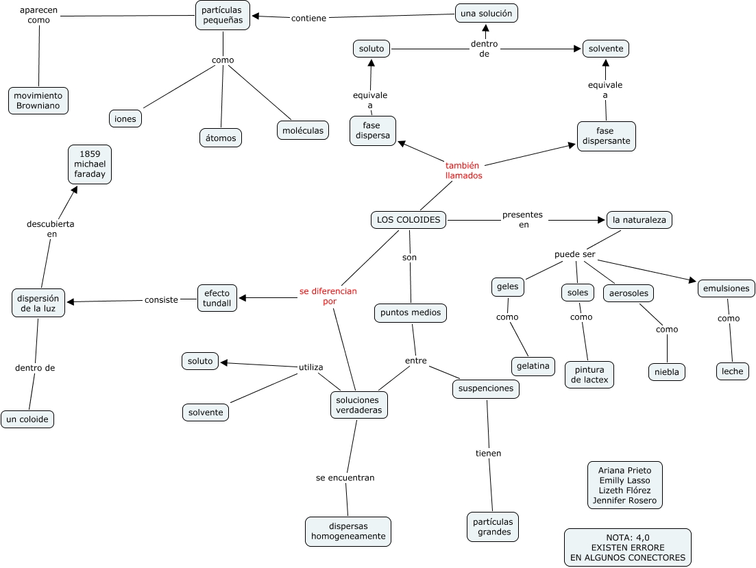Este Cmap, tiene información relacionada con: los coloides, puntos medios entre suspenciones, puntos medios entre soluciones verdaderas, LOS COLOIDES son puntos medios, partículas pequeñas aparecen como movimiento Browniano, partículas pequeñas como átomos, soluto dentro de solvente, emulsiones como leche, partículas pequeñas como iones, aerosoles como niebla, LOS COLOIDES presentes en la naturaleza, la naturaleza puede ser aerosoles, LOS COLOIDES también llamados fase dispersa, una solución contiene partículas pequeñas, efecto tundall consiste dispersión de la luz, suspenciones tienen partículas grandes, soles como pintura de lactex, LOS COLOIDES se diferencian por efecto tundall, dispersión de la luz descubierta en 1859 michael faraday, fase dispersante equivale a solvente, soluto dentro de una solución