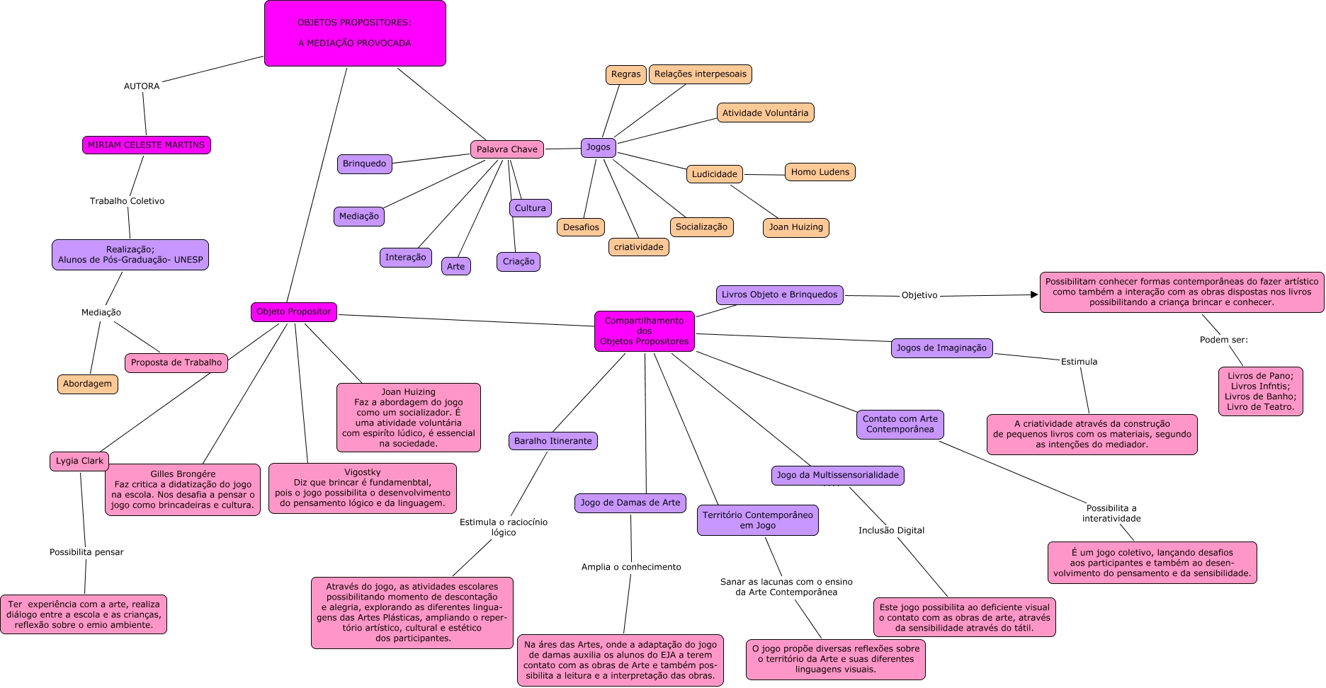 Esse mapa conceitual, produzido no IHMC CmapTools, tem a informação relacionada a: objetos propositores, Palavra Chave ???? Criação, Livros Objeto e Brinquedos Objetivo Possibilitam conhecer formas contemporâneas do fazer artístico como também a interação com as obras dispostas nos livros possibilitando a criança brincar e conhecer., Compartilhamento dos Objetos Propositores ???? Baralho Itinerante, Palavra Chave ???? Arte, OBJETOS PROPOSITORES: A MEDIAÇÃO PROVOCADA ???? Palavra Chave, OBJETOS PROPOSITORES: A MEDIAÇÃO PROVOCADA ???? Objeto Propositor, Palavra Chave ???? Interação, Objeto Propositor ???? Compartilhamento dos Objetos Propositores, Jogos ???? Ludicidade, Palavra Chave ???? Mediação, Território Contemporâneo em Jogo Sanar as lacunas com o ensino da Arte Contemporânea O jogo propõe diversas reflexões sobre o território da Arte e suas diferentes linguagens visuais., Compartilhamento dos Objetos Propositores ???? Território Contemporâneo em Jogo, Objeto Propositor ???? Vigostky Diz que brincar é fundamenbtal, pois o jogo possibilita o desenvolvimento do pensamento lógico e da linguagem., Baralho Itinerante Estimula o raciocínio lógico Através do jogo, as atividades escolares possibilitando momento de descontação e alegria, explorando as diferentes lingua- gens das Artes Plásticas, ampliando o reper- tório artístico, cultural e estético dos participantes., Jogos ???? Desafios, Objeto Propositor ???? Joan Huizing Faz a abordagem do jogo como um socializador. É uma atividade voluntária com espiríto lúdico, é essencial na sociedade., Jogos ???? Relações interpesoais, Realização; Alunos de Pós-Graduação- UNESP Mediação Abordagem, Lygia Clark Possibilita pensar Ter experiência com a arte, realiza diálogo entre a escola e as crianças, reflexão sobre o emio ambiente., Palavra Chave ???? Cultura