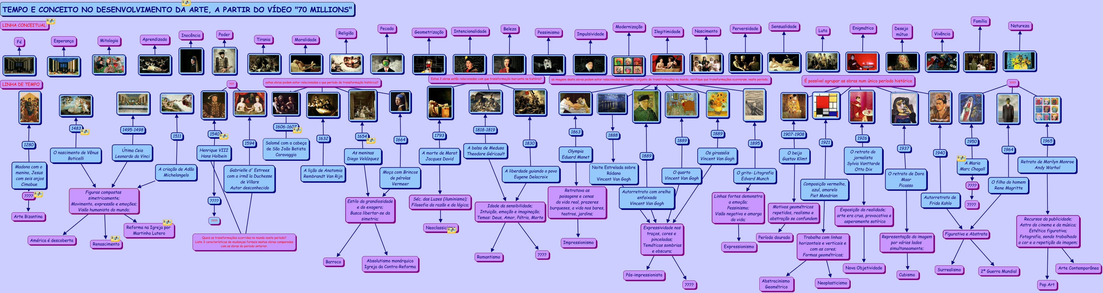 Esse mapa conceitual, produzido no IHMC CmapTools, tem a informação relacionada a: Linha_do_tempo, A criação de Adão Michelangelo Figuras compostas simetricamente; Movimento, expressão e emoções; Visão humanista do mundo; Renascimento, A balsa de Medusa Theodore Géricault 1818-1819, ??? ????, Útima Ceia Leonardo da Vinci Figuras compostas simetricamente; Movimento, expressão e emoções; Visão humanista do mundo; Renascimento, ???? Pecado, as imagens desta obras podem estar relacionadas ao mesmo conjunto de transformações no mundo, verifique que transformações ocorreram. neste período. ????, ???? Luta, ???? Vivência, A morte de Marat Jacques David 1793, ???? Mitologia, as imagens desta obras podem estar relacionadas ao mesmo conjunto de transformações no mundo, verifique que transformações ocorreram. neste período. ????, A liberdade guiando o povo Eugene Delacroix Idade da sensibilidade; Intuição, emoção e imaginação; Temas: Deus, Amor, Pátria, Morte Romantismo, as imagens desta obras podem estar relacionadas ao mesmo conjunto de transformações no mundo, verifique que transformações ocorreram. neste período. ????, 1888 Noite Estrelada sobre Ródano Vincent Van Gogh, Retrato de Marilyn Monroe Andy Warhol Recursos da publicidade; Astro do cinema e da música; Estética figurativa; Fotografia, sendo trabalhado a cor e a repetição da imagem; Pop Art, A lição de Anatomia Rembrandt Van Rijn 1632, ???? Natureza, Os girassóis Vincent Van Gogh Expressividade nos traços, cores e pinceladas; Temáticas sombrias e obscura; ????, Útima Ceia Leonardo da Vinci Figuras compostas simetricamente; Movimento, expressão e emoções; Visão humanista do mundo; Reforma na Igreja por Martinho Lutero, A Maria Marc Chagall ???? ????