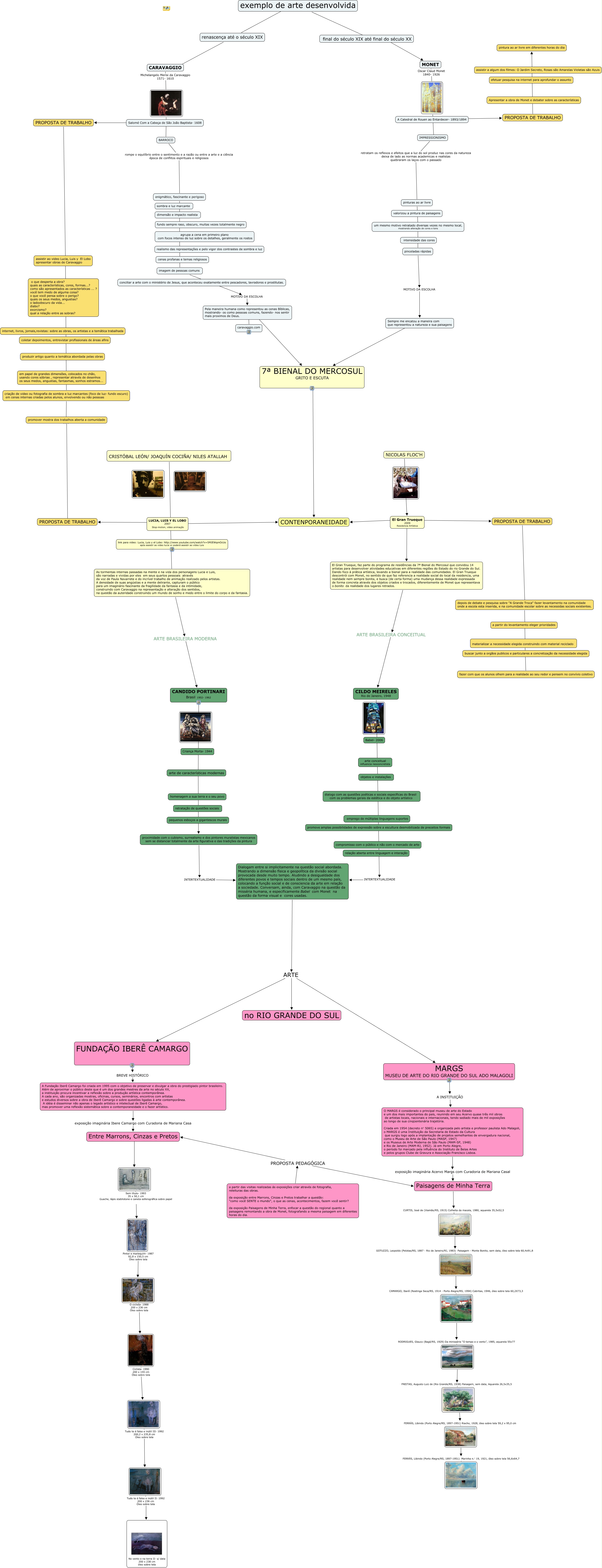Esse mapa conceitual, produzido no IHMC CmapTools, tem a informação relacionada a: MAPA PROFESSOR PESQUISADOR, Sem título- 1993 35 x 50,1 cm Guache, lápis stabilotone e caneta esferográfica sobre papel, A Catedral de Rouen ao Entardecer- 1893/1894 ???? PROPOSTA DE TRABALHO, ???? BARROCO, Pela maneira humana como representou as cenas Bíblicas, mostrando- os como pessoas comuns, fazendo- nos sentir mais proximos de Deus. ???? 7ª BIENAL DO MERCOSUL GRITO E ESCUTA, pinceladas rápidas MOTIVO DA ESCOLHA Sempre me encatou a maneira com que representou a natureza e sua paisagens, El Gran Trueque 2009 Residencia Artística ???? El Gran Trueque, faz parte do programa de residências da 7ª Bienal do Mercosul que convidou 14 artistas para desenvolver atividades educativas em diferentes regiões do Estado do rio Grande do Sul. Dando foco à prática artística, levando a bienal para a realidade das comunidades. El Gran Trueque descontrói com Monet, no sentido de que faz referencia a realidade social do local da residencia, uma realidade nem sempre bonita, e busca (de certa forma) uma mudança dessa realidade expressada de forma concreta através dos objetos criados e trocados, diferentemente de Monet que representava o bonito da realidade dos lugares retrados., A Fundação Iberê Camargo foi criada em 1995 com o objetivo de preservar e divulgar a obra do prestigiado pintor brasileiro. Além de aproximar o público deste que é um dos grandes mestres da arte no século XX, a instituição procura incentivar a reflexão sobre a produção artística contemporânea. A cada ano, são organizadas mostras, oficinas, cursos, seminários, encontros com artistas e estudos diversos sobre a obra de Iberê Camargo e sobre questões ligadas à arte contemporânea. A idéia é disseminar não apenas o legado artístico e intelectual de Iberê Camargo, mas promover uma reflexão sistemática sobre a contemporaneidade e o fazer artístico. exposição imaginária Ibere Camargo com Curadoria de Mariana Casa Entre Marrons, Cinzas e Pretos, a partir das visitas realizadas ás exposições criar através de fotografia, releituras das obras. da exposição entre Marrons, Cinzas e Pretos trabalhar a questão: "como você SENTE o mundo", o que as cenas, acontecimentos, fazem você sentir? da exposição Paisagens de Minha Terra, enfocar a questão do regional quanto a paisagens remontando a obra de Monet, fotografando a mesma paisagem em diferentes horas do dia. PROPOSTA PEDAGÓGICA Entre Marrons, Cinzas e Pretos, imagem de pessoas comuns MOTIVO DA ESCOLHA Pela maneira humana como representou as cenas Bíblicas, mostrando- os como pessoas comuns, fazendo- nos sentir mais proximos de Deus., enigmático, fascinante e perigoso ???? imagem de pessoas comuns, Sempre me encatou a maneira com que representou a natureza e sua paisagens ???? 7ª BIENAL DO MERCOSUL GRITO E ESCUTA, depois de debate e pesquisa sobre "A Grande Troca" fazer levantamento na comunidade onde a escola esta inserida, e na comunidade escolar sobre as necessidas sociais existentes. ???? fazer com que os alunos olhem para a realidade ao seu redor e pensem no convívio coletivo, CARAVAGGIO Michelangelo Merisi da Caravaggio 1571- 1610, criação de video ou fotografia de sombra e luz marcantes (foco de luz- fundo escuro) em cenas internas criadas pelos alunos, envolvendo ou não pessoas ???? promover mostra dos trabalhos aberta a comunidade, enigmático, fascinante e perigoso ???? agrupa a cena em primeiro plano com focos intenso de luz sobre os detalhes, geralmente os rostos, pinturas ao ar livre ???? pinceladas rápidas, promover mostra dos trabalhos aberta a comunidade ???? PROPOSTA DE TRABALHO, O MARGS é considerado o principal museu de arte do Estado e um dos mais importantes do país, reunindo em seu Acervo quase três mil obras de artistas locais, nacionais e internacionais, tendo sediado mais de mil exposições ao longo de sua cinqüentenária trajetória. Criada em 1954 (decreto n° 5065) e organizada pelo artista e professor paulista Ado Malagoli, o MARGS é uma Instituição da Secretaria de Estado da Cultura que surgiu logo após a implantação de projetos semelhantes de envergadura nacional, como o Museu de Arte de São Paulo (MASP, 1947) e os Museus de Arte Moderna de São Paulo (MAM-SP, 1948) e Rio de Janeiro (MAM-RJ, 1952). Já em Porto Alegre, o período foi marcado pela influência do Instituto de Belas Artes e pelos grupos Clube de Gravura e Associação Francisco Lisboa. exposição imaginária Acervo Margs com Curadoria de Mariana Casal Paisagens de Minha Terra, ???? Salomé Com a Cabeça de São João Baptista- 1608, LUCIA, LUIS Y EL LOBO 2007 Stop-motion, vídeo animação ???? CONTENPORANEIDADE