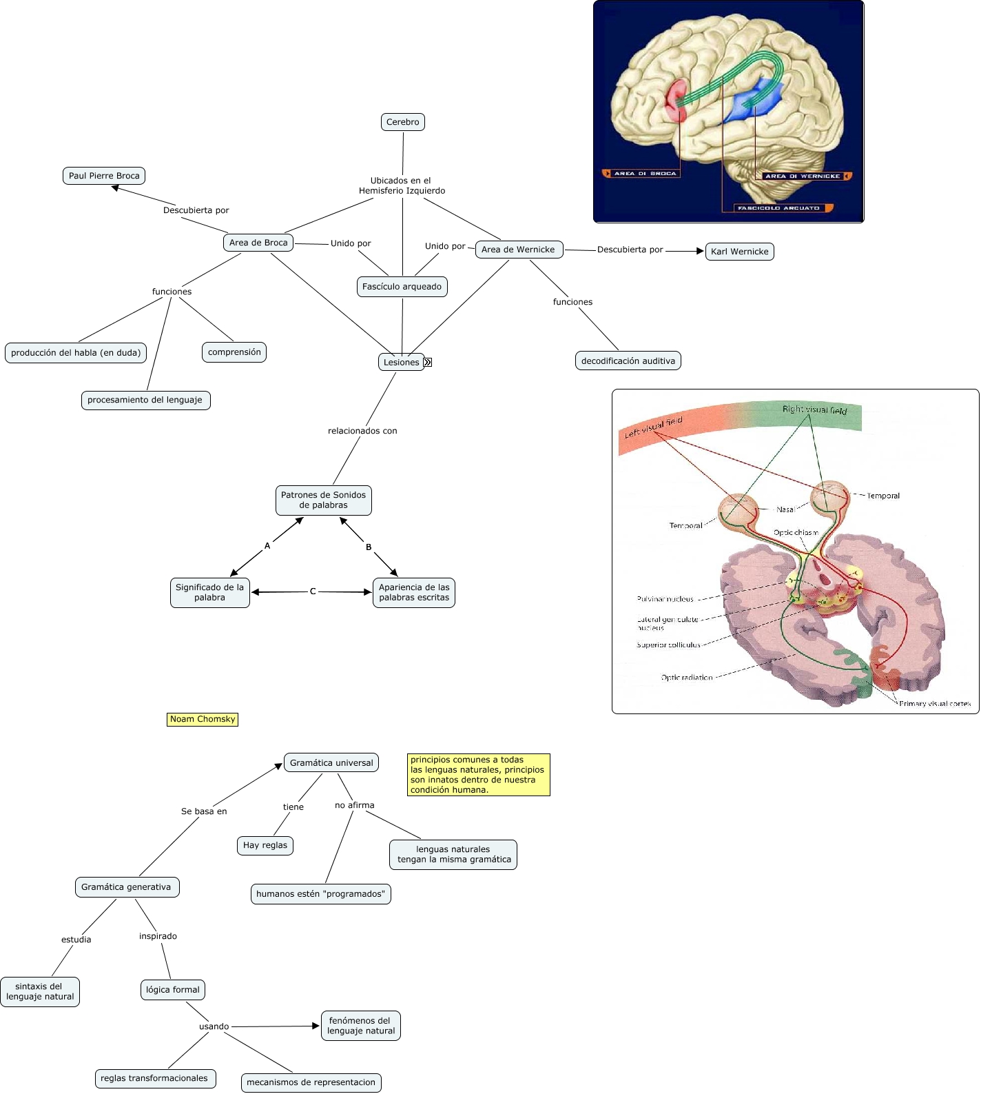 This Concept Map, created with IHMC CmapTools, has information related to: Lenguaje, Area de Broca Lesiones Afasia de Wernicke, Lesiones relacionados con Patrones de Sonidos de palabras, Area de Wernicke funciones decodificación auditiva, Afasia de Broca Sintomas habla poco y tiene conciencia de sus errores, Gramática universal no afirma humanos estén "programados", Afasia de Wernicke Síntomas no entiende que le dicen, Afasia de Wernicke Caracteristicas dificultades para comprender y entender el habla, Area de Broca funciones producción del habla (en duda), Apariencia de las palabras escritas B Patrones de Sonidos de palabras, alexia Caracteristica pérdida de la capacidad de leer, cuando ya fue adquirida previamente, Afasia de Broca Sintomas su articulación es deficiente, Afasia de conducción Caracteristicas muchas pausas para buscar palabras, Cerebro Ubicados en el Hemisferio Izquierdo Area de Wernicke, Significado de la palabra A Patrones de Sonidos de palabras, Cerebro Ubicados en el Hemisferio Izquierdo Fascículo arqueado, Fascículo arqueado Lesiones Afasia de conducción, Afasia de Broca Sintomas empleo de frases cortas (habla telegráfica), Area de Wernicke Lesiones Afasia de conducción, lógica formal usando fenómenos del lenguaje natural, Area de Broca funciones procesamiento del lenguaje