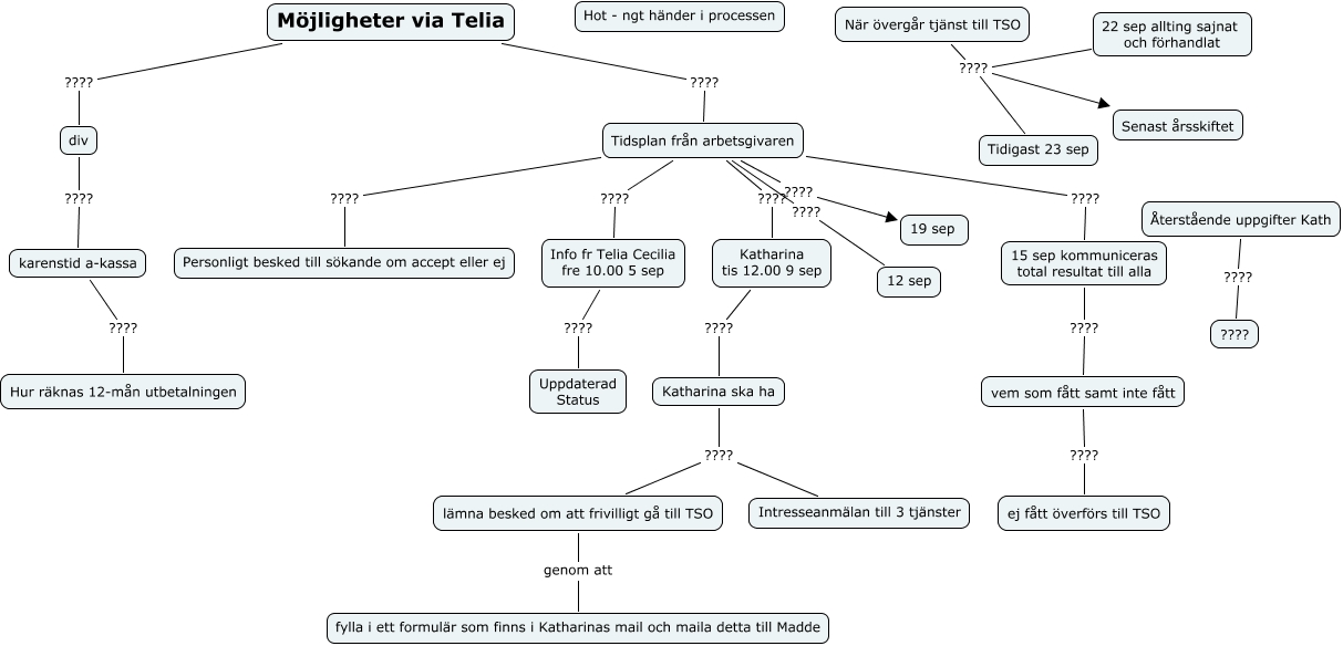 Den här kartan innehåller information om: Telia omställning 2, Info fr Telia Cecilia fre 10.00 5 sep ???? Uppdaterad Status, div ???? karenstid a-kassa, Katharina ska ha ???? lämna besked om att frivilligt gå till TSO, Katharina tis 12.00 9 sep ???? Katharina ska ha, 22 sep allting sajnat och förhandlat ???? Senast årsskiftet, Tidsplan från arbetsgivaren ???? 19 sep, karenstid a-kassa ???? Hur räknas 12-mån utbetalningen, Tidsplan från arbetsgivaren ???? Info fr Telia Cecilia fre 10.00 5 sep, vem som fått samt inte fått ???? ej fått överförs till TSO, När övergår tjänst till TSO ???? Tidigast 23 sep, 22 sep allting sajnat och förhandlat ???? Tidigast 23 sep, 15 sep kommuniceras total resultat till alla ???? vem som fått samt inte fått, Möjligheter via Telia ???? Tidsplan från arbetsgivaren, Återstående uppgifter Kath ???? ????, Tidsplan från arbetsgivaren ???? 15 sep kommuniceras total resultat till alla, Tidsplan från arbetsgivaren ???? Katharina tis 12.00 9 sep, Tidsplan från arbetsgivaren ???? 12 sep, Tidsplan från arbetsgivaren ???? Personligt besked till sökande om accept eller ej, Katharina ska ha ???? Intresseanmälan till 3 tjänster, Möjligheter via Telia ???? div