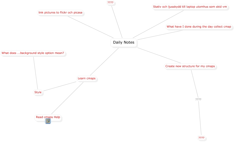 Den här kartan innehåller information om: Daily Notes, Learn cmaps Read cmaps Help, Style What does ...background style option mean?, Daily Notes What have I done during the day collect cmap, Daily Notes Stativ och ljusskydd till laptop utomhus som skid vm, Create new structure for my cmaps ???? ????, Daily Notes ????, Daily Notes Create new structure for my cmaps, Daily Notes Learn cmaps, Learn cmaps Style, Daily Notes link pictures to flickr och picasa