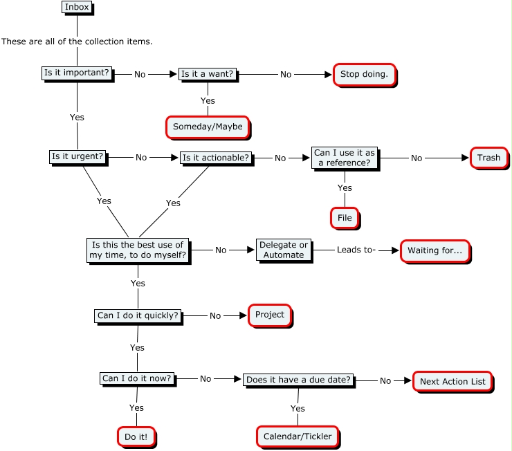 Den här kartan innehåller information om: GTD Decision Matrix, Inbox These are all of the collection items. Is it important?, Is it a want? No Stop doing., Can I use it as a reference? No Trash, Is it important? Yes Is it urgent?, Is it urgent? Yes Is this the best use of my time, to do myself?, Is it actionable? Yes Is this the best use of my time, to do myself?, Can I do it quickly? No Project, Delegate or Automate Leads to- Waiting for..., Can I use it as a reference? Yes File, Can I do it now? No Does it have a due date?, Is it a want? Yes Someday/Maybe, Is it urgent? No Is it actionable?, Does it have a due date? Yes Calendar/Tickler, Can I do it now? Yes Do it!, Is it important? No Is it a want?, Does it have a due date? No Next Action List, Is it actionable? No Can I use it as a reference?, Is this the best use of my time, to do myself? No Delegate or Automate, Can I do it quickly? Yes Can I do it now?, Is this the best use of my time, to do myself? Yes Can I do it quickly?