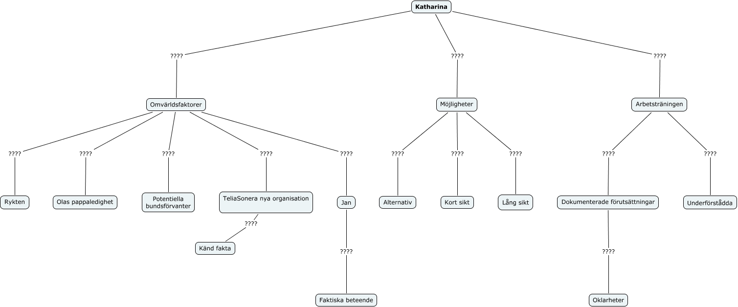 Den här kartan innehåller information om: Katharina, TeliaSonera nya organisation ???? Känd fakta, Katharina ???? Arbetsträningen, Katharina ???? Omvärldsfaktorer, Arbetsträningen ???? Dokumenterade förutsättningar, Omvärldsfaktorer ???? Potentiella bundsförvanter, Omvärldsfaktorer ???? Jan, Möjligheter ???? Kort sikt, Arbetsträningen ???? Underförstådda, Omvärldsfaktorer ???? Olas pappaledighet, Katharina ???? Möjligheter, Jan ???? Faktiska beteende, Omvärldsfaktorer ???? Rykten, Dokumenterade förutsättningar ???? Oklarheter, Möjligheter ???? Alternativ, Omvärldsfaktorer ???? TeliaSonera nya organisation, Möjligheter ???? Lång sikt