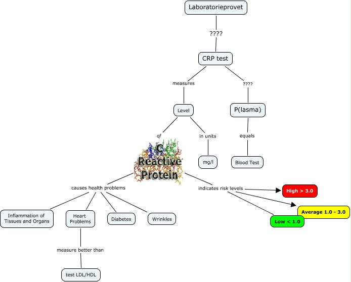 Den här kartan innehåller information om: Laboratorieprovet, Level in units mg/l, indicates risk levels Average 1.0 - 3.0, causes health problems Wrinkles, causes health problems Inflammation of Tissues and Organs, CRP test ???? P(lasma), Level of, CRP test measures Level, causes health problems Diabetes, causes health problems Heart Problems, indicates risk levels High > 3.0, P(lasma) equals Blood Test, indicates risk levels Low < 1.0, Heart Problems measure better than test LDL/HDL, Laboratorieprovet ???? CRP test