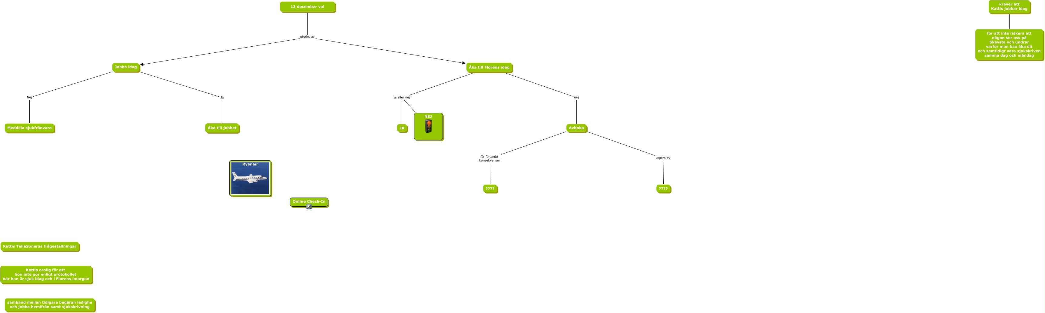 Den här kartan innehåller information om: Kattis - TeliaSonera, Åka till Florens idag ja eller nej JA, Jobba idag Ja Åka till jobbet, Jobba idag Nej Meddela sjukfrånvaro, 13 december val utgörs av Jobba idag, Avboka utgörs av ????, Åka till Florens idag nej Avboka, Åka till Florens idag ja eller nej NEJ, 13 december val utgörs av Åka till Florens idag, Avboka får följande konsekvenser ????, kräver att Kattis jobbar idag för att inte riskera att någon ser oss på Skavsta och undrar varför man kan åka dit och samtidigt vara sjukskriven samma dag och måndag