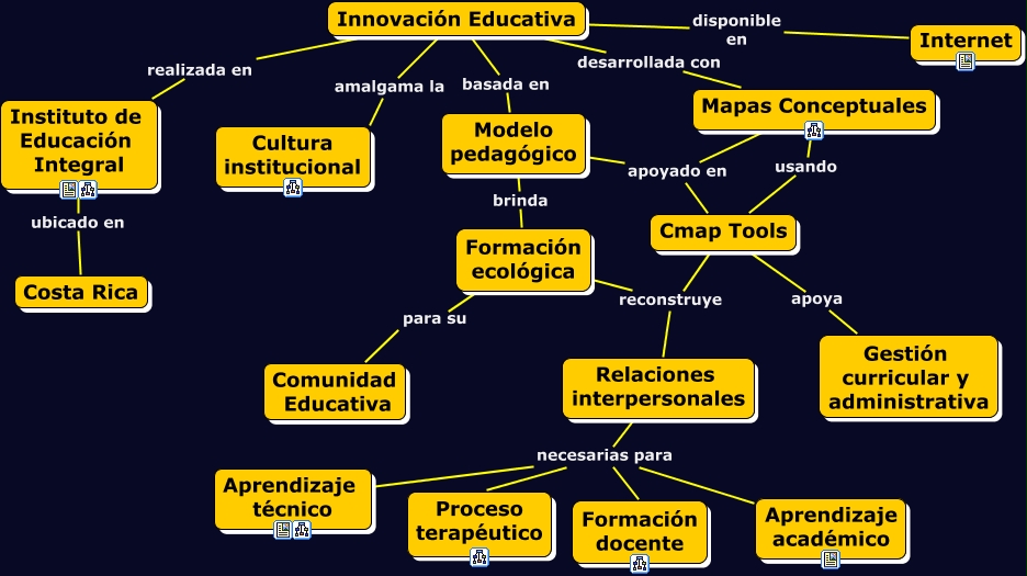 Este Cmap, tiene información relacionada con: Innovación educativa, Modelo pedagógico apoyado en Cmap Tools, Modelo pedagógico brinda Formación ecológica, Cmap Tools reconstruye Relaciones interpersonales, Innovación Educativa realizada en Instituto de Educación Integral, Formación ecológica para su Comunidad Educativa, Cmap Tools apoya Gestión curricular y administrativa, Relaciones interpersonales necesarias para Aprendizaje técnico, Innovación Educativa basada en Modelo pedagógico, Innovación Educativa desarrollada con Mapas Conceptuales, Instituto de Educación Integral ubicado en Costa Rica, Innovación Educativa disponible en Internet, Formación ecológica reconstruye Relaciones interpersonales, Mapas Conceptuales usando Cmap Tools, Relaciones interpersonales necesarias para Formación docente, Innovación Educativa amalgama la Cultura institucional, Modelo pedagógico apoyado en Mapas Conceptuales, Relaciones interpersonales necesarias para Aprendizaje académico, Relaciones interpersonales necesarias para Proceso terapéutico