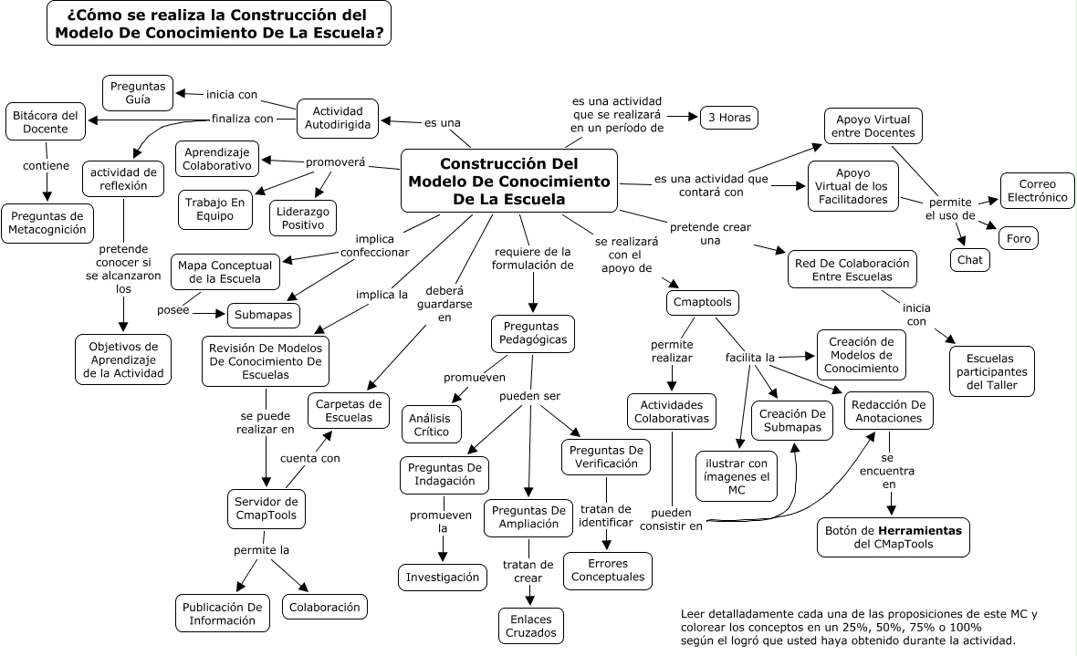 Este Cmap, tiene información relacionada con: Experiencia de Aprendizaje Autodirigido (E-Learning) - Taller 4.08 - Impreso, Actividad Autodirigida finaliza con Bitácora del Docente, Construcción Del Modelo De Conocimiento De La Escuela implica la Revisión De Modelos De Conocimiento De Escuelas, Cmaptools facilita la Redacción De Anotaciones, Mapa Conceptual de la Escuela posee Submapas, Cmaptools facilita la ilustrar con ímagenes el MC, Actividades Colaborativas pueden consistir en Redacción De Anotaciones, Construcción Del Modelo De Conocimiento De La Escuela promoverá Aprendizaje Colaborativo, Construcción Del Modelo De Conocimiento De La Escuela promoverá Liderazgo Positivo, Red De Colaboración Entre Escuelas inicia con Escuelas participantes del Taller, Construcción Del Modelo De Conocimiento De La Escuela es una actividad que contará con Apoyo Virtual entre Docentes, Revisión De Modelos De Conocimiento De Escuelas se puede realizar en Servidor de CmapTools, Apoyo Virtual de los Facilitadores permite el uso de Chat, Construcción Del Modelo De Conocimiento De La Escuela es una actividad que contará con Apoyo Virtual de los Facilitadores, Cmaptools facilita la Creación De Submapas, Construcción Del Modelo De Conocimiento De La Escuela deberá guardarse en Carpetas de Escuelas, Preguntas Pedagógicas pueden ser Preguntas De Indagación, Preguntas Pedagógicas promueven Análisis Crítico, Preguntas De Verificación tratan de identificar Errores Conceptuales, Construcción Del Modelo De Conocimiento De La Escuela es una actividad que se realizará en un período de 3 Horas, Apoyo Virtual entre Docentes permite el uso de Correo Electrónico