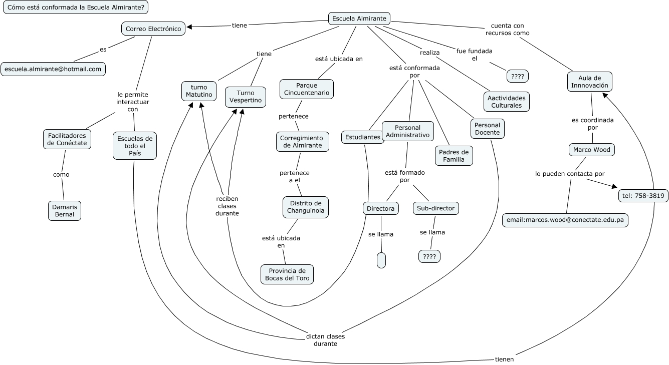 Este Cmap, tiene información relacionada con: Escuela Almirante - Bocas del Toro, Estudiantes reciben clases durante turno Matutino, Personal Docente dictan clases durante Turno Vespertino, Escuela Almirante cuenta con recursos como Aula de Innnovación, Personal Administrativo está formado por Sub-director, Marco Wood lo pueden contacta por tel: 758-3819, Aula de Innnovación es coordinada por Marco Wood, Parque Cincuentenario pertenece Corregimiento de Almirante, Directora se llama, Escuela Almirante está conformada por Padres de Familia, Personal Docente dictan clases durante turno Matutino, Escuela Almirante está ubicada en Parque Cincuentenario, Correo Electrónico le permite interactuar con Escuelas de todo el País, Sub-director se llama ????, Escuela Almirante tiene turno Matutino, Escuela Almirante está conformada por Personal Administrativo, Escuela Almirante tiene Correo Electrónico, Escuela Almirante realiza Aactividades Culturales, Estudiantes reciben clases durante Turno Vespertino, Correo Electrónico es escuela.almirante@hotmail.com, Escuela Almirante está conformada por Estudiantes