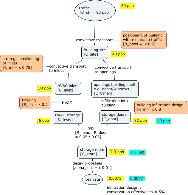 This Concept Map, created with IHMC CmapTools, has information related to: simple_branched_num, openings building shell e.g. doors/windows [C_bshell] infiltration into building building infiltration design [R_inf= x 0.8], Building site [C_site] convective transport to openings openings building shell e.g. doors/windows [C_bshell], Building site [C_site] convective transport to inlets HVAC inlets [C_inlet], Traffic [C_str = 80 ppb] convective transport positioning of building with respect to traffic [R_bpos = x 0.5], storage room [C_store] decay processes [alpha_loss = x 0.01] loss rate, openings building shell e.g. doors/windows [C_bshell] infiltration into building storage doors [C_door], HVAC inlets [C_inlet] HVAC filtering [R_filt = x 0.2, HVAC storage [C_hvac] mix [R_hvac : R_door = 0.95 : 0.05] storage room [C_store], storage doors [C_door] mix [R_hvac : R_door = 0.95 : 0.05] storage room [C_store], HVAC inlets [C_inlet] HVAC HVAC storage [C_hvac], Building site [C_site] convective transport to inlets strategic positioning of inlets [R_inl = x 0.75], Traffic [C_str = 80 ppb] convective transport Building site [C_site]